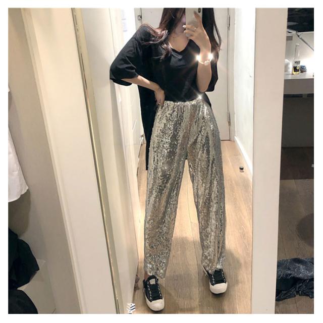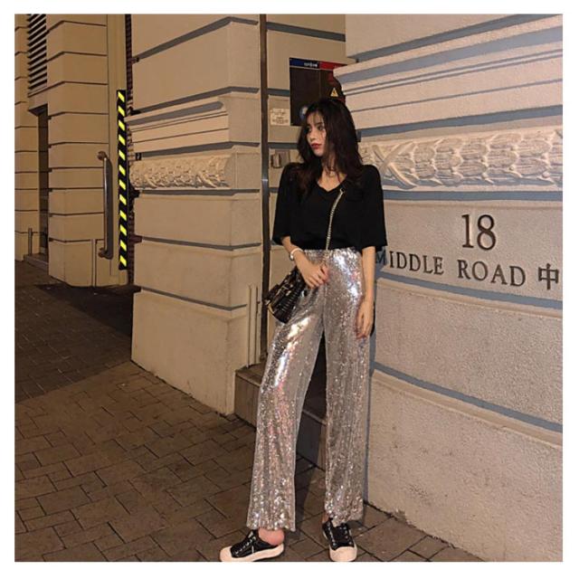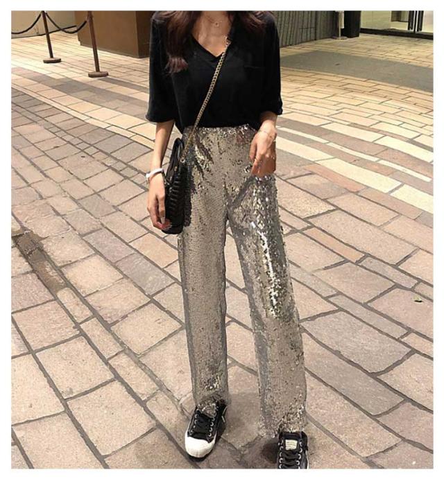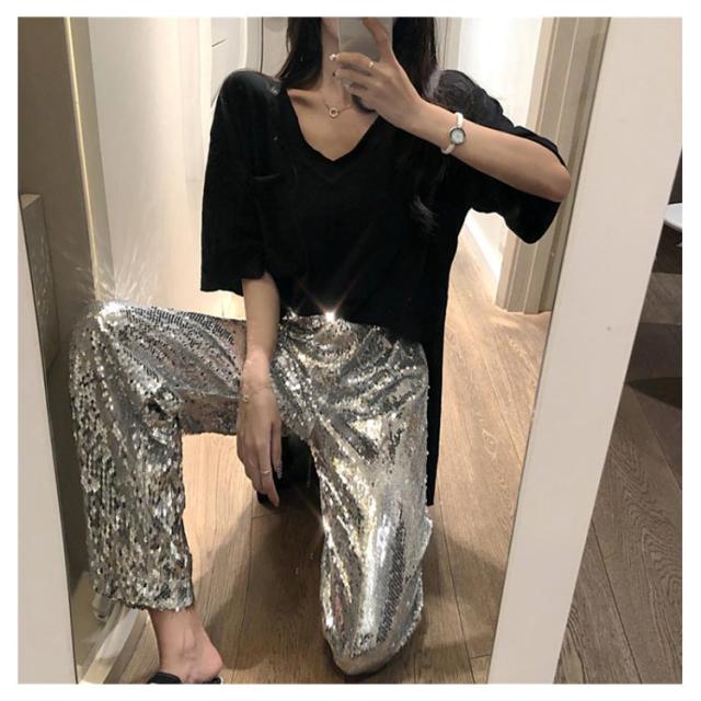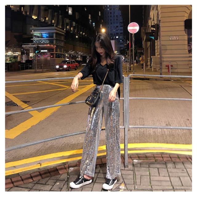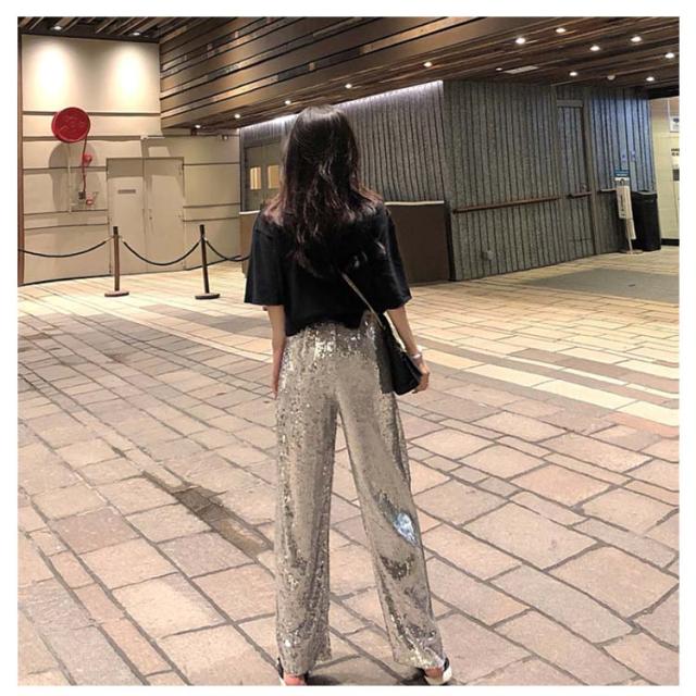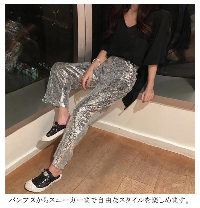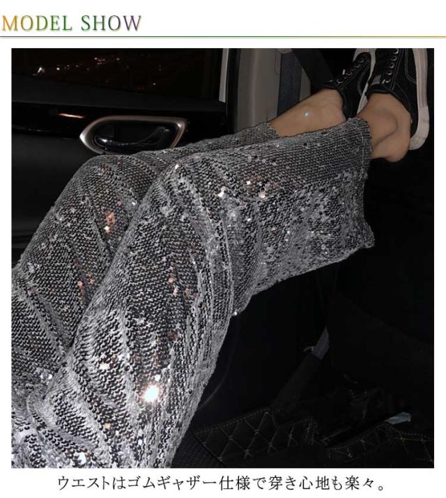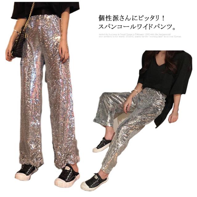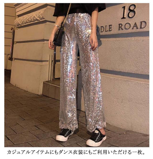 【送料無料】ワイドパンツ スパンコールパンツ レディース ガウチョパンツ ストレートパンツ ロングパンツ ハイウエスト カジュアル ヒップホップ ダンス衣装 公演服