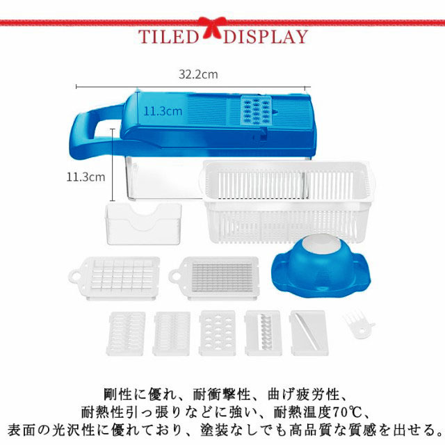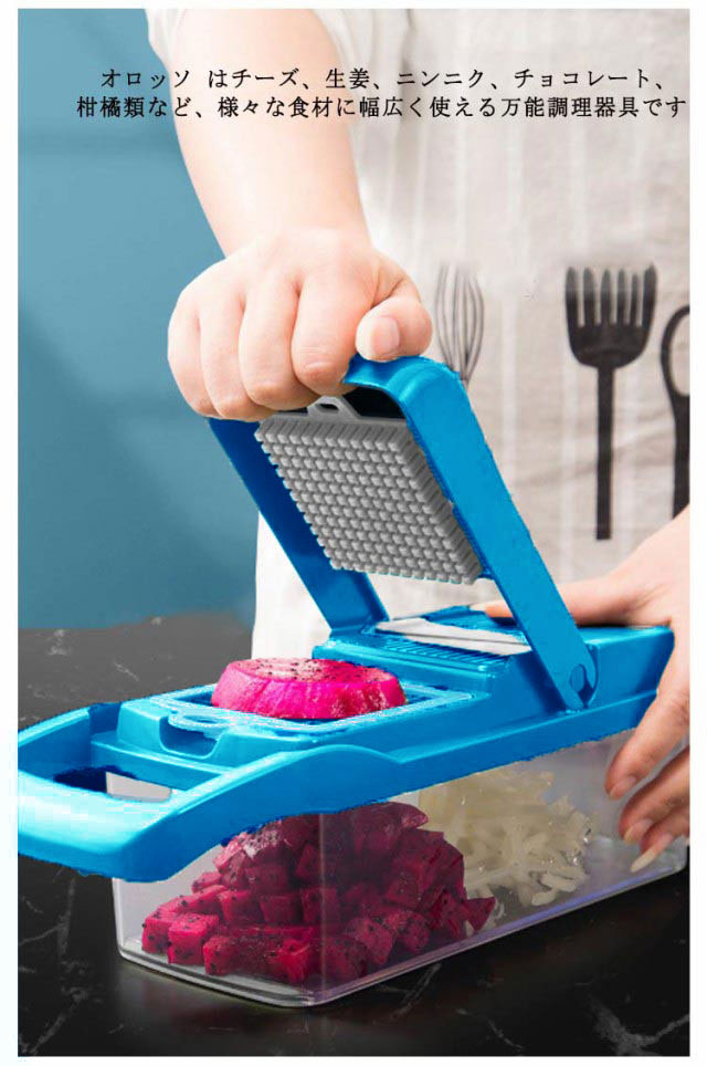 | 【ABS食品レベルの材料】剛性に優れ、耐衝撃性、曲げ疲労性、耐熱性引っ張りなどに強い、耐熱温度70℃、表面の光沢性に優れており、塗装なしでも高品質な質感を出せる。 【おろし作業はこれ1つ】 オロッソ はチーズ、生姜、ニンニク、チョコレート、柑橘類など、様々な食材に幅広く使える万能調理器具です。食材の魅力を最大限に引き出し、お料理の幅がグンと広がります。 【プロなガジェット】 取り替えの6つブレード、ステンレス製、切れ味抜群、鋭いで、洗う時に気をつけてください。角切り、おろし、スライス、千切り、つまり切りなど、食材が引っかかることなく、軽い力で簡単におろすことができます。 【多機能野菜スライサー】料理作業を手早く、楽にしてくれます。 人参はつかみやすくスライサーを使うとこんなにきれいに細く切ることができます。透明な収納ボックス、安全材質、便利、厚い、洗いやすい。 【お友達にもおススメ】 スライサーは食材のスライスやみじん切りなどを簡単に行える便利なキッチンアイテム、料理にかかる時間や手間を減らせるので、料理好きの方はもちろん料理初心者の方にもおすすめです。 | |