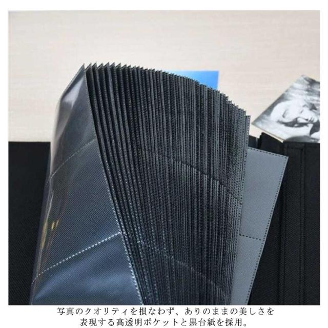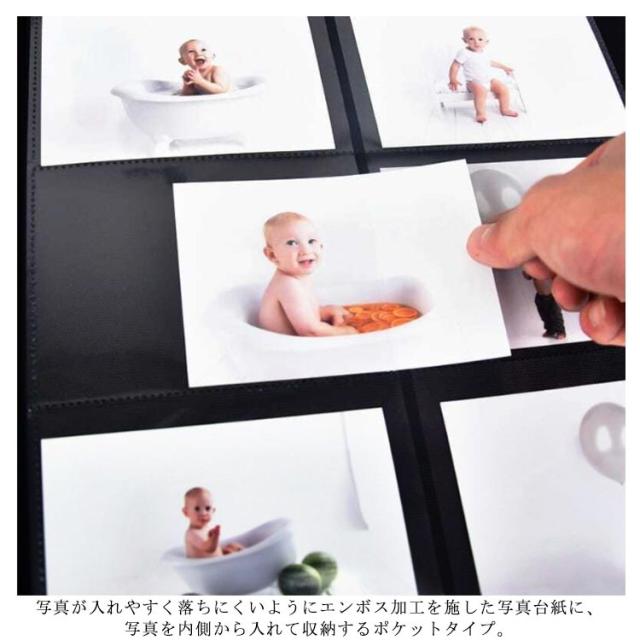 | シンプルで写真の整理がしやすいポケット台紙は、1ページに6枚、L版サイズ(8.9cm×12.7cm)の写真を600枚収納可能です。 大切な家族の写真や、友人との思い出の写真はついつい溜まってしまいますが、これだけの容量があればいつでも楽しい気持ちで思い出すことが出来ます。 写真が入れやすく落ちにくいようにエンボス加工を施した写真台紙に、写真を内側から入れて収納するポケットタイプ。 写真のクオリティを損なわず、ありのままの美しさを表現する高透明ポケットと黒台紙を採用。 | |