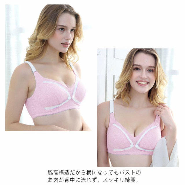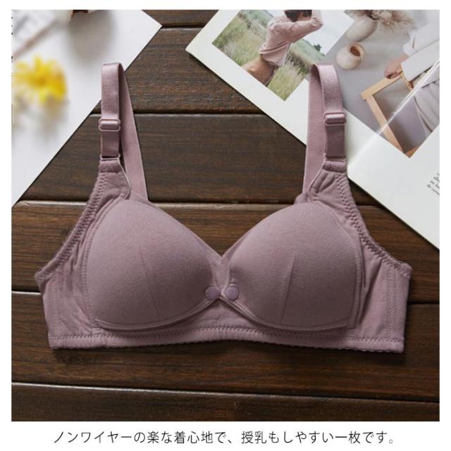| 優しいフィット感でバストを包み込むカップ裏は綿100%、通気性がよく、肌触りの良い生地感です。 普段より幅の広いストラップで肩の負担も軽減。 脇高構造だから横になってもバストのお肉が背中に流れず、スッキリ綺麗。 ノンワイヤーの楽な着心地で、授乳もしやすい一枚です。 前開きデザインですから、授乳中に片手でブラジャーのボタンを外して授乳することができ、赤ちゃんを抱っこしながら授乳するのに便利です。 | |