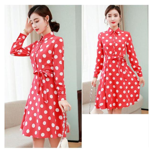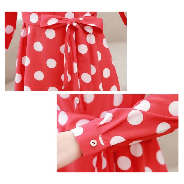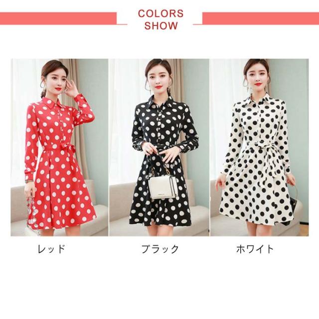 ドット柄 シャツワンピース レディース ロングワンピース ドット柄ワンピース 春秋 長袖 ウエスト紐 ベルト付き サーキュラースカート 送料無料 シンプル カジュアル オシャレ フォーマル 通勤 普段着 ナチュラル