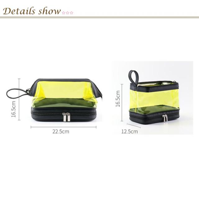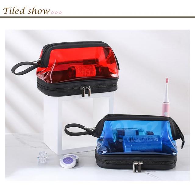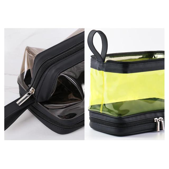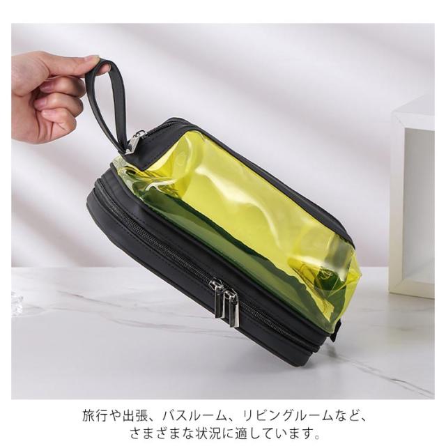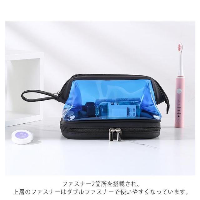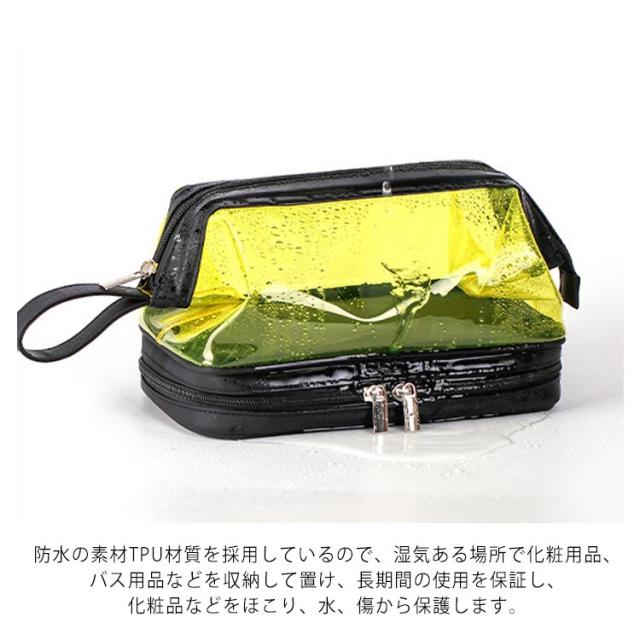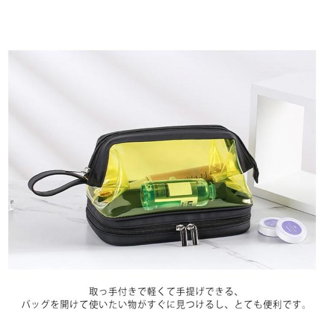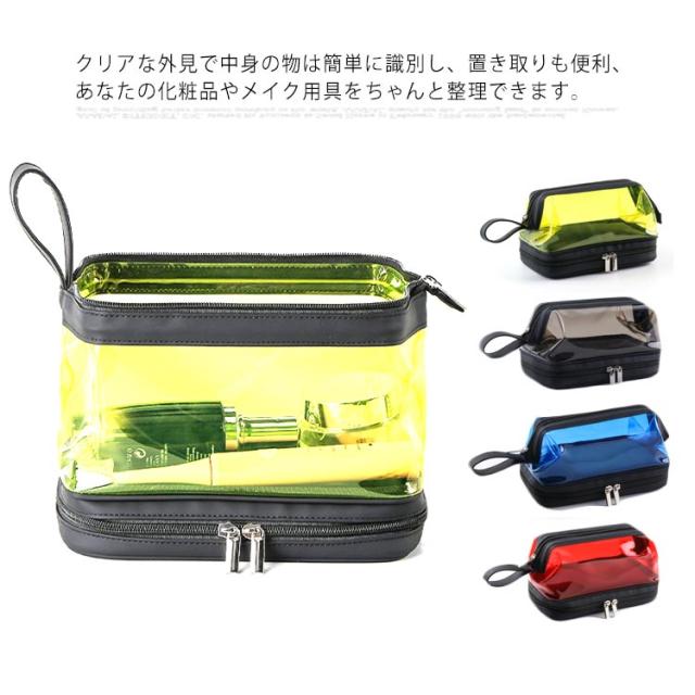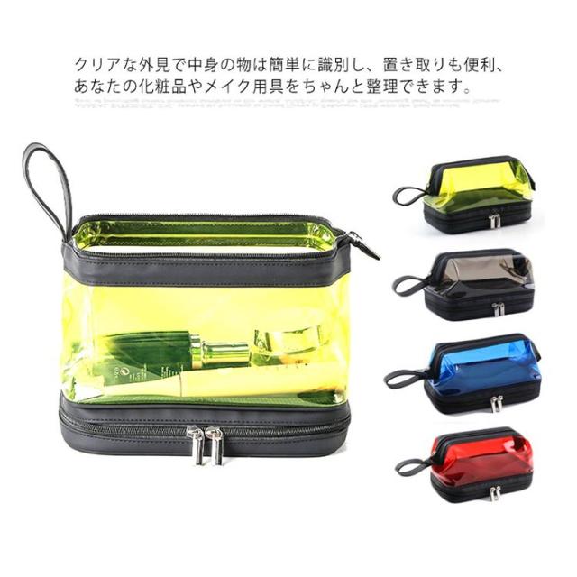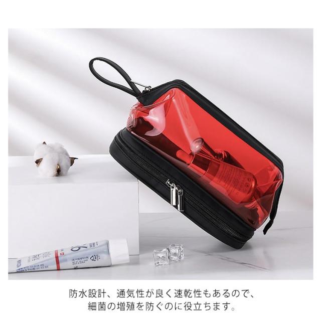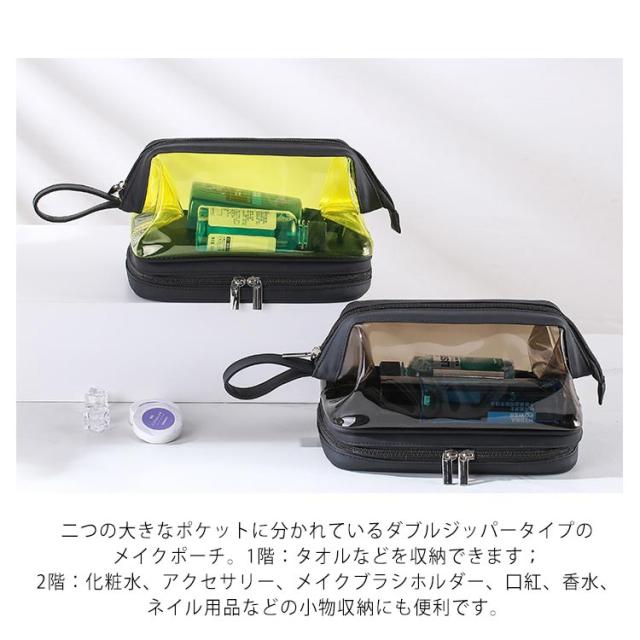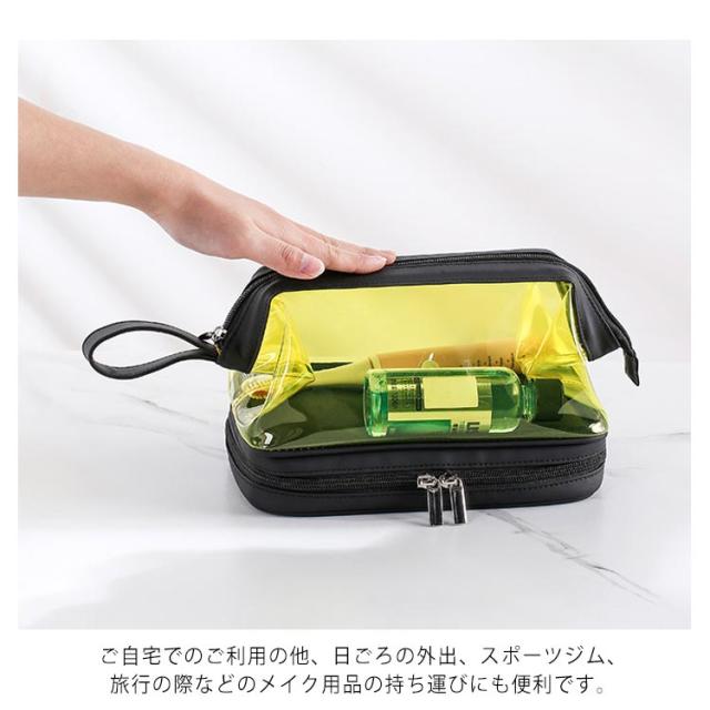| (透明のデザイン)クリアな外見で中身の物は簡単に識別し、置き取りも便利、あなたの化粧品やメイク用具をちゃんと整理できます。 (2層式大容量収納)二つの大きなポケットに分かれているダブルジッパータイプのメイクポーチ。1階:タオルなどを収納できます;2階:化粧水、アクセサリー、メイクブラシホルダー、口紅、香水、ネイル用品などの小物収納にも便利です。旅行用化粧品だけでなく、ヘッドフォン、充電器、充電宝物などのような電子アクセサリーの収納にも。 (TPU防水素材)防水の素材TPU材質を採用しているので、湿気ある場所で化粧用品、バス用品などを収納して置け、長期間の使用を保証し、化粧品などをほこり、水、傷から保護します。 (使い便利)防水設計、通気性が良く速乾性もあるので、細菌の増殖を防ぐのに役立ちます。ファスナー2箇所を搭載され、上層のファスナーはダブルファスナーで使いやすくなっています。 (持ち運び便利)取っ手付きで軽くて手提げできる、バッグを開けて使いたい物がすぐに見つけるし、とても便利です。お洒落なデザインでたっぷりのメイク道具をスキリ収納出来る。ご自宅でのご利用の他、日ごろの外出、スポーツジム、旅行の際などのメイク用品の持ち運びにも便利です。旅行や出張、バスルーム、リビングルームなど、さまざまな状況に適しています。 | |