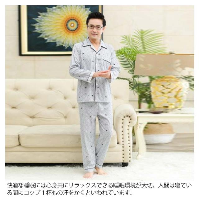 | (肌触り最高なパジャマ)綿生地を採用するので、通気性、吸汗性、透湿性に優れ、汗をかいてもねばねば感じがないです。伸縮性に優れた素材を使用していますので、疲れにくくフィット感抜群です。ふんわり柔らかな着心地、最高な肌触りです。 (睡眠時間中を快適に過ごせる)快適な睡眠には心身共にリラックスできる睡眠環境が大切。人間は寝ている間にコップ1杯もの汗をかくといわれています。パジャマの通気性や吸収性も大切な役割です。気持ちがリラックスするようなふわふわの安心感。汗や水分をしっかり吸収しさらっとになります。 (開襟シャツ風のデザイン)落ち着いた色調とシンプルなデザインで年代問わず幸せ感が満点です。前開きのメンズ綿製パジャマで、おしゃれに快適な睡眠を楽しみましょう。綺麗に縫われた個性的な開襟シャツ風のパジャマは平らで変形しにくい、袖口はシンプルです。 (締め付けず快適な穿き心地)締め付け感のないウエストゴムで動きやすく、ストレッチで快適に寝返り易くになります! 縫製にもこだわりがお肌への刺激を最小限にして縫い目がお肌に当たらずチクチクしないので、敏感肌の方も安心です。 | |