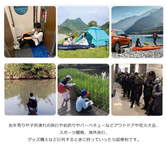 | 軽量・丈夫・コンパクト コンパクトでスペースがいらなく持ち運びにとっても便利な伸縮式スツール。 ワンタッチでお好きな高さに調節できるから、子供から大人まで誰でも心地良く使える。 軽くて荷物にならない。手提げしたり、カバンみたいに肩に掛けたりして持ち運び便利。 おしゃれな専用収納バッグ付きで、いつでも綺麗に 耐荷重150KG、丈夫な素材と作りで安心安全! お年寄りや子供連れの旅行やお釣りやバーベキューなどアウトドアや花火大会、スポーツ観戦、海外旅行、グッズ購入など行列するときに持っていったら超便利です。 | |