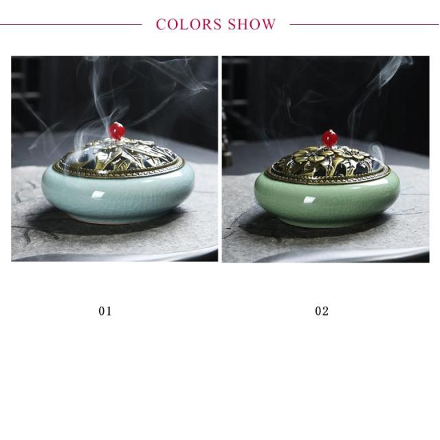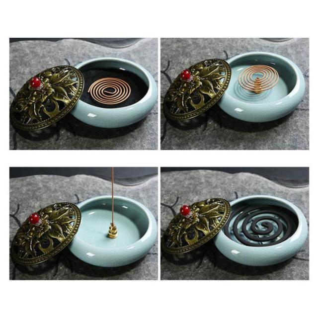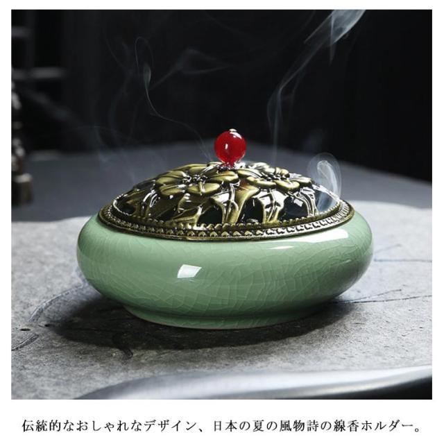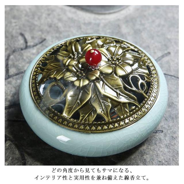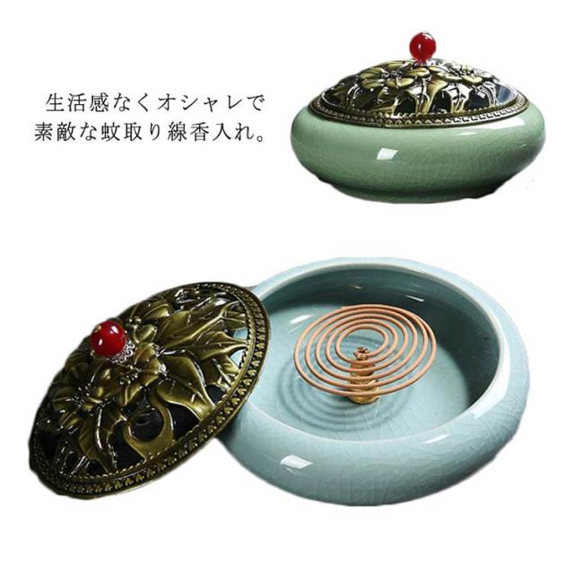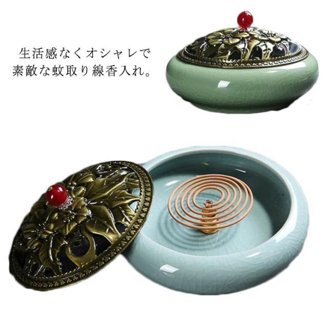 お香入れ お線香炉 お香立て 陶器 蚊取り線香入れ 蚊遣り 虫除け 蓋付 丸型 睡眠香炉 渦巻香 コイル香 線香差し 不燃綿付き クラシック インテリア
