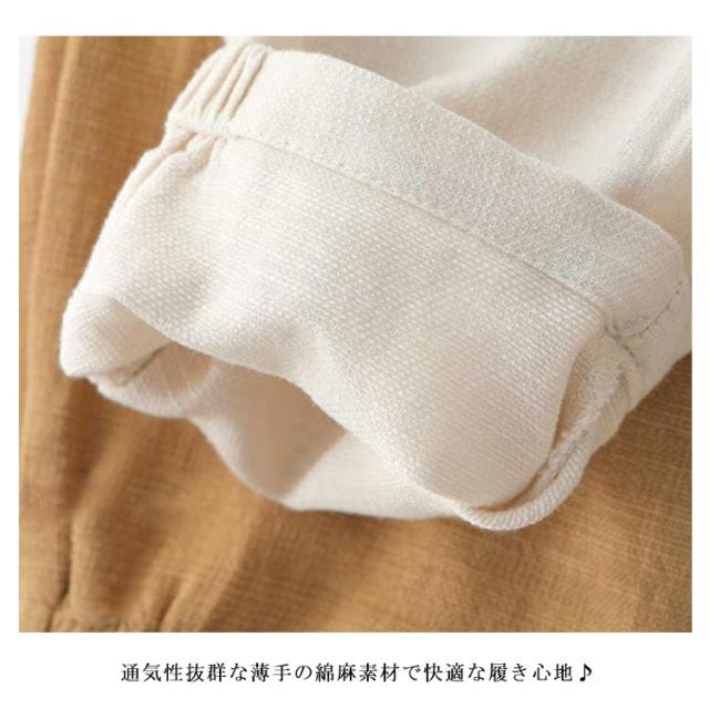 | 夏に最適な綿麻パンツ♪ ウエストゴムなので、楽ちんです♪ 通気性抜群な薄手の綿麻素材で快適な履き心地♪ 足裾にゴムが付いてる仕様で虫対策にも役立つ♪ 普段着だけでなく部屋着としても◎ | |