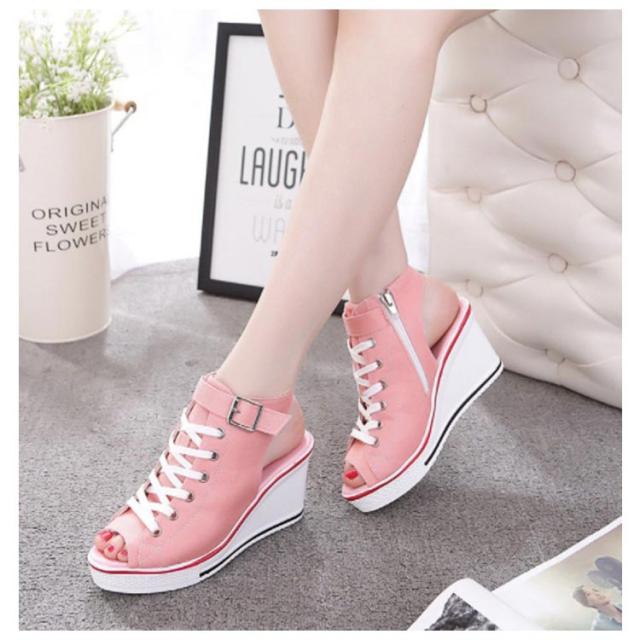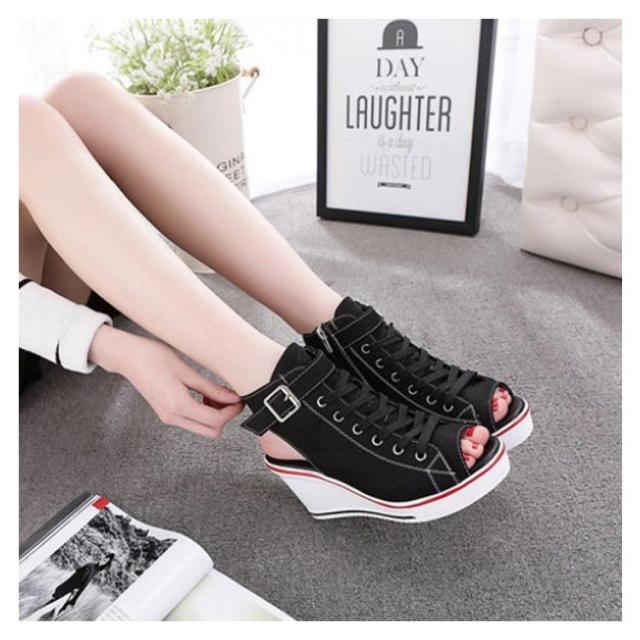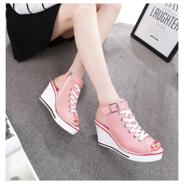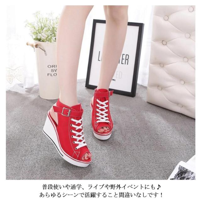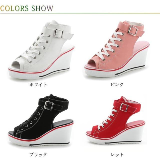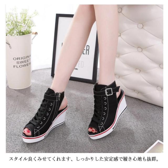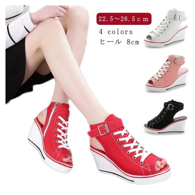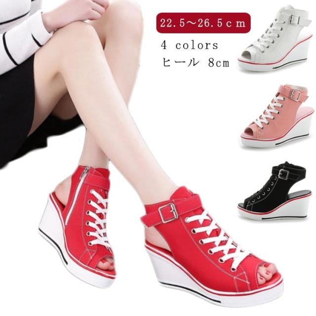 スニーカーサンダル レーディス 厚底サンダル ハイヒール キャンバス シューズ サンダル スニーカー レースアップシューズ ヒール8cm ウェッジソール カジュアル レースアップ シューズ 美脚