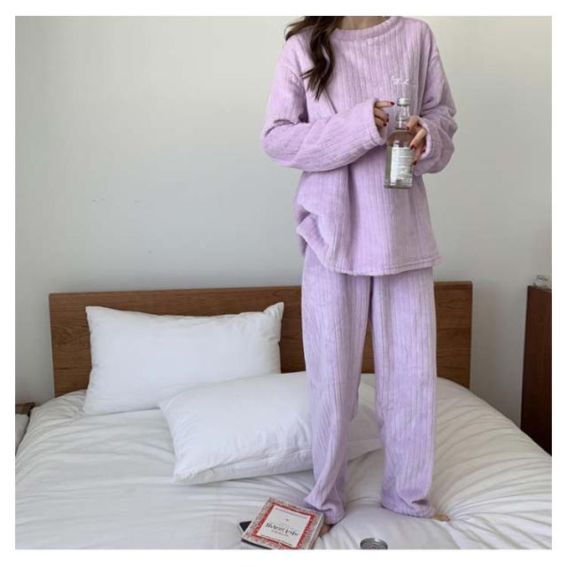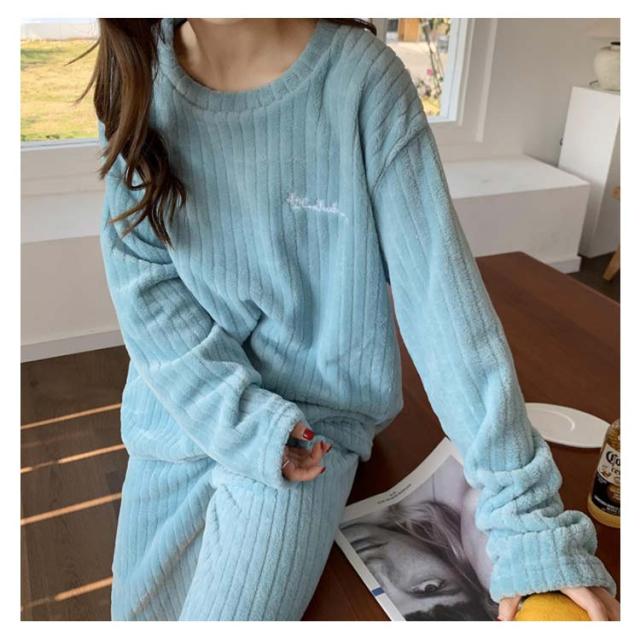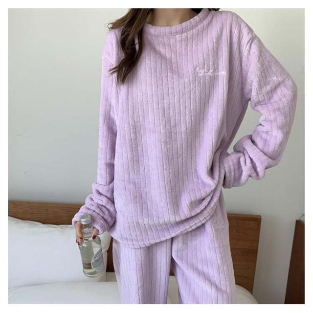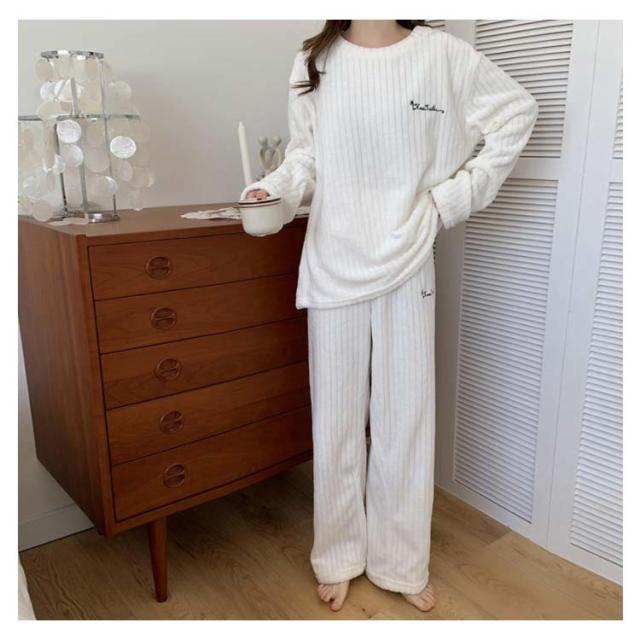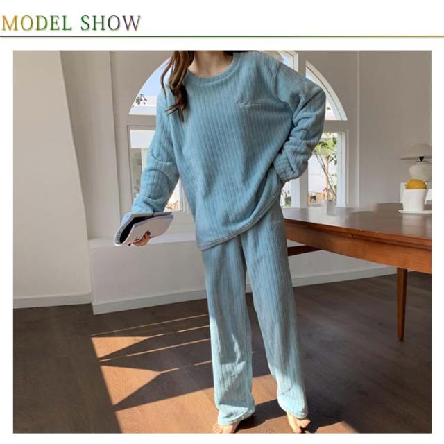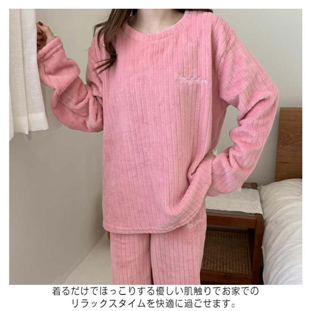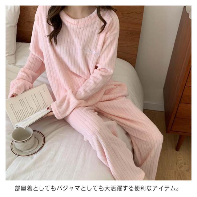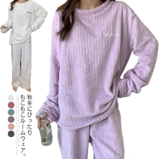 もこもこルームウェア パジャマ 上下セット セットアップ カットソー プルオーバー ワイドパンツ ガウチョパンツ 長袖 ストライプ ボーダー ナイトウェア 寝巻き 寝間着 秋冬用 部屋着 暖かい 防寒 リラックスウエアト ゆったり おしゃれ マタニティ