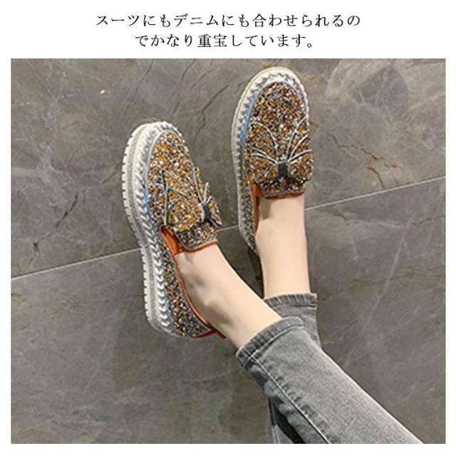 | キラキラスパンコールが目を引く厚底スリッポン。 グリッターがキラキラと輝き、足元が一気に華やかな印象に。 厚底デザインで脚長効果はもちろん、クッションが効いているので足の負担を軽減してくれます。 柔らかい素材を使用しており、長時間履いても足が痛くなりにくい。 スーツにもデニムにも合わせられるのでかなり重宝しています。 | |