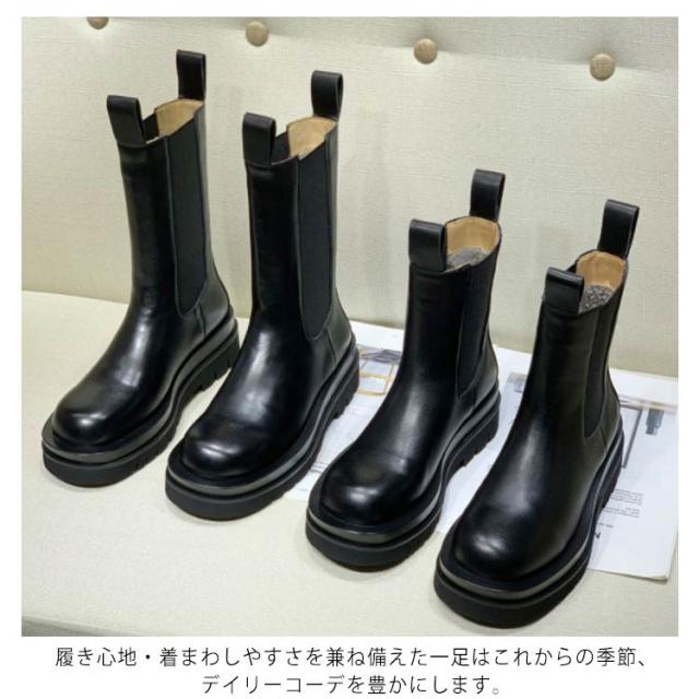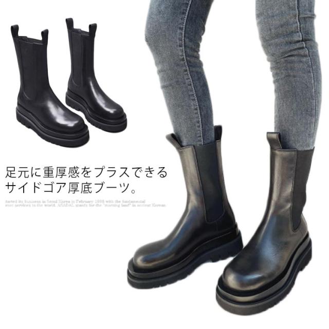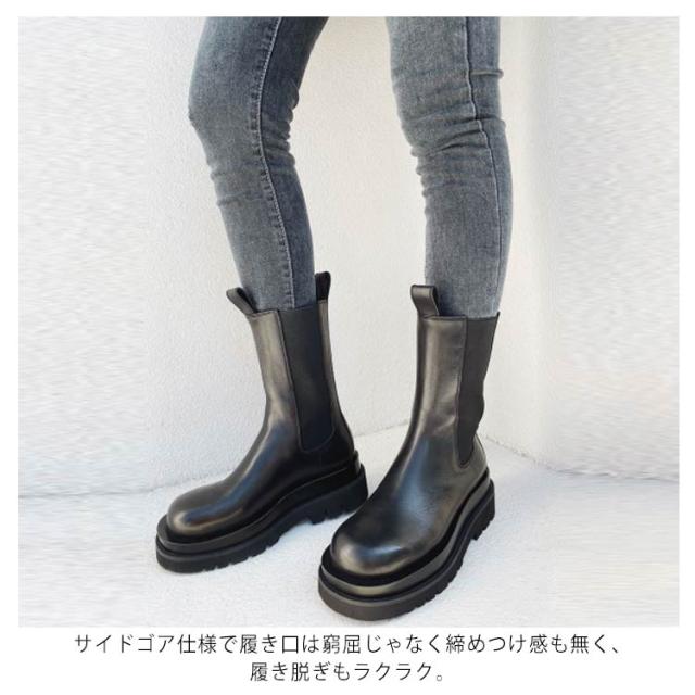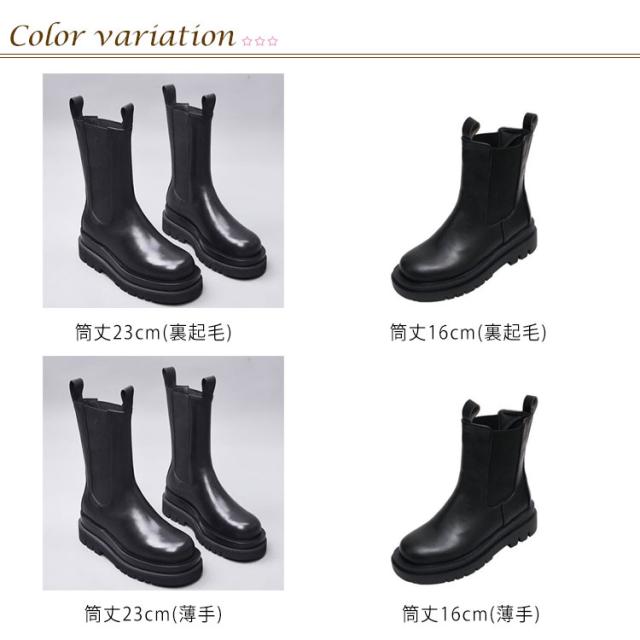 | 足元に重厚感をプラスできるサイドゴア厚底ブーツ。 ショート丈&ミドル丈、裏起毛&起毛無し、お好きのように選んでいただけます。 サイドゴア仕様で履き口は窮屈じゃなく締めつけ感も無く、履き脱ぎもラクラク。 厚底のアウトソールもゴツ過ぎず歩きやすくて美脚効果バツグン。 中は少しフワフワしてるので疲れにくい。 ワンピースやスカートに合わせるととても可愛い。 履き心地・着まわしやすさを兼ね備えた一足はこれからの季節、デイリーコーデを豊かにします。 | |