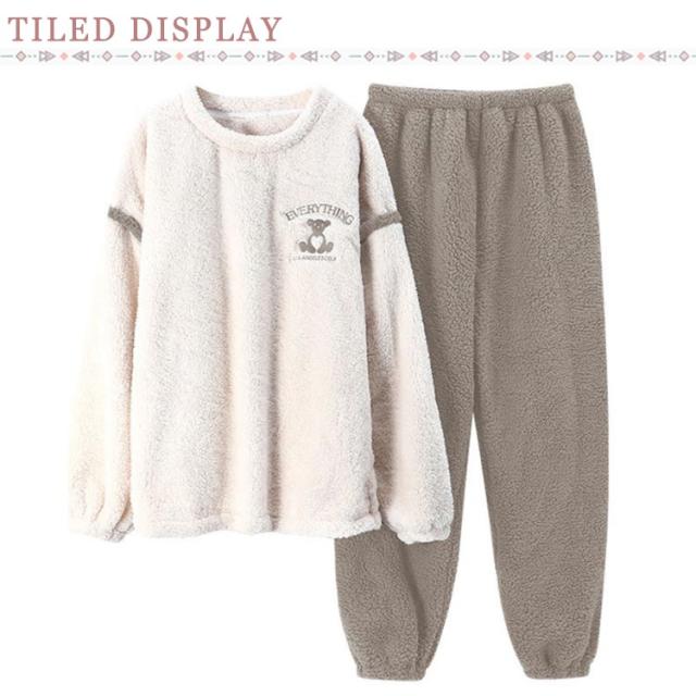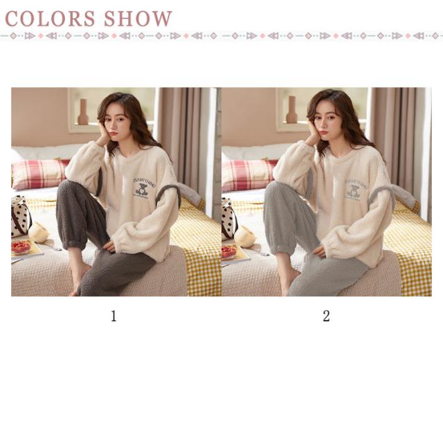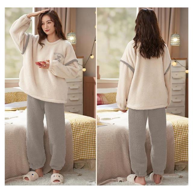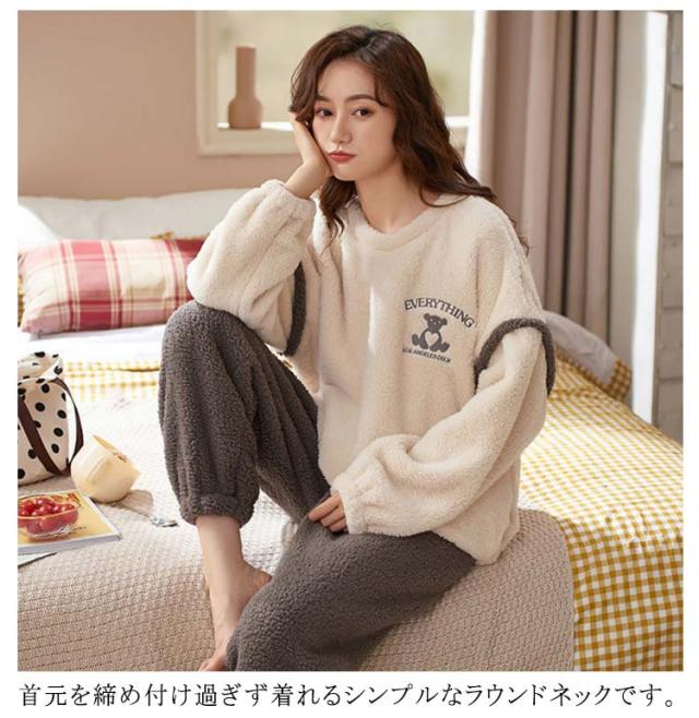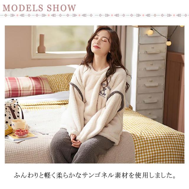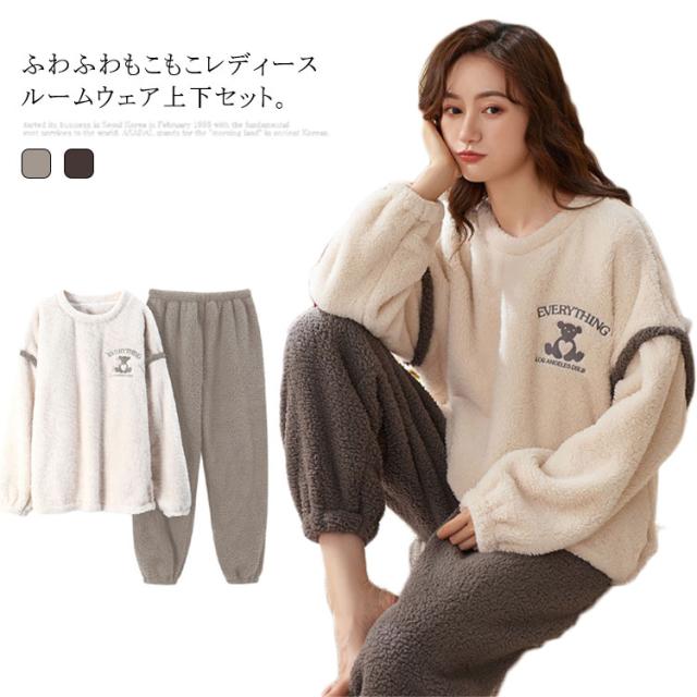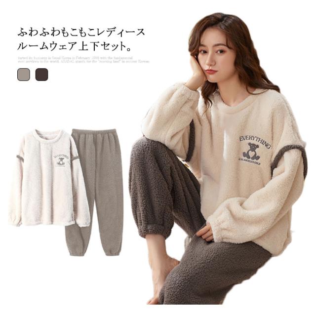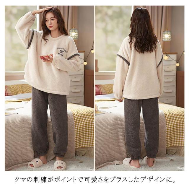 ルームウェア レディース 上下セット 暖かい もこもこ パジャマ 厚手 起毛 秋冬 ふわふわ フリース ゆったり 刺繍 可愛い ポケット付 部屋着 あったか 肌に優しい 長ズボン 寝間着