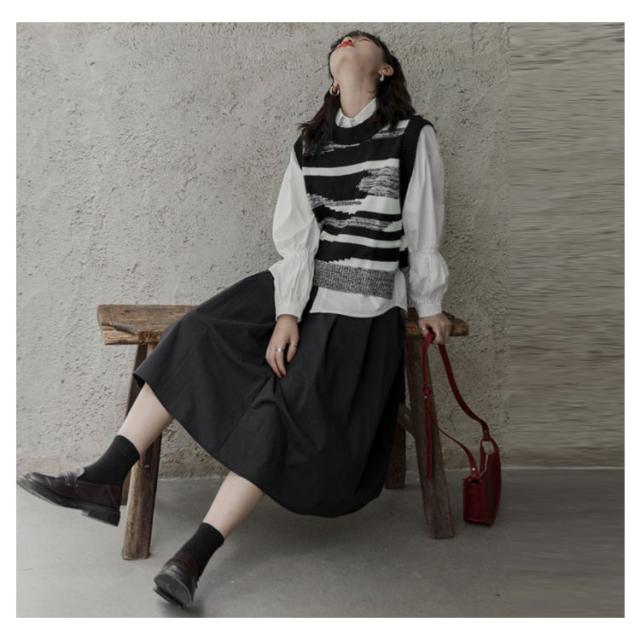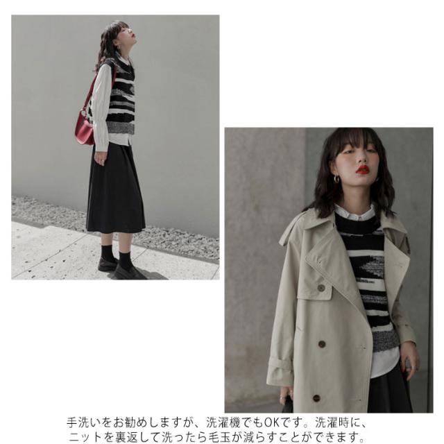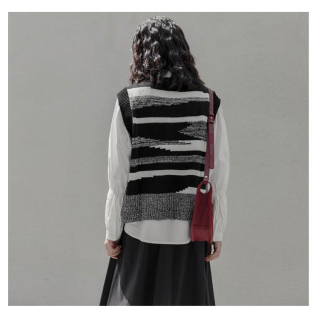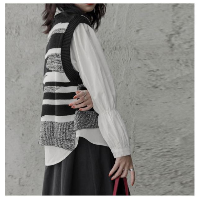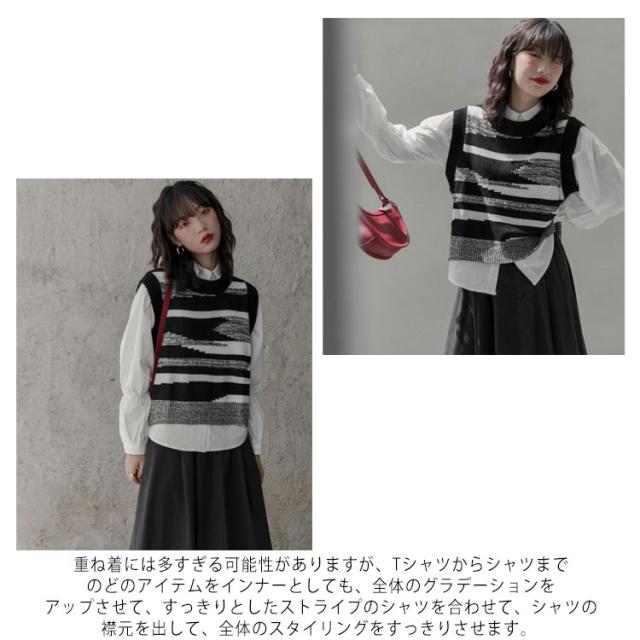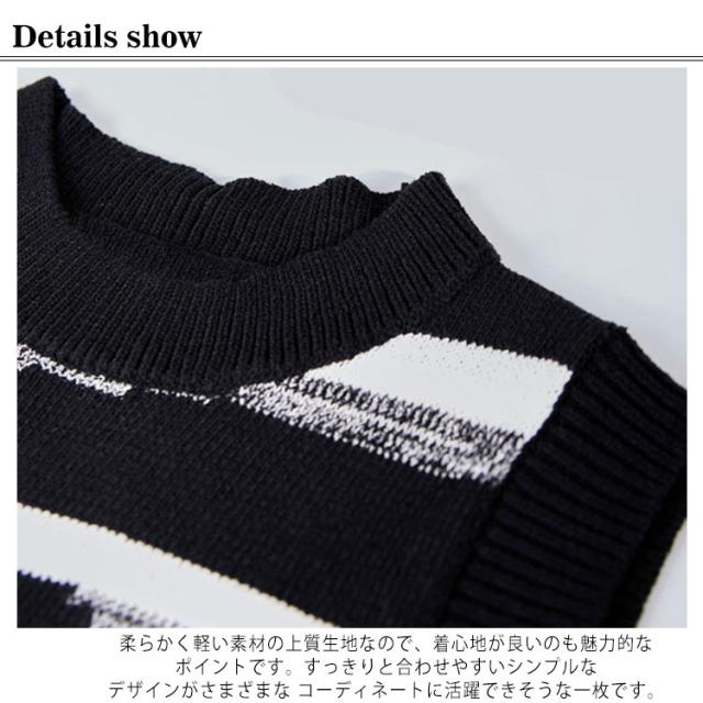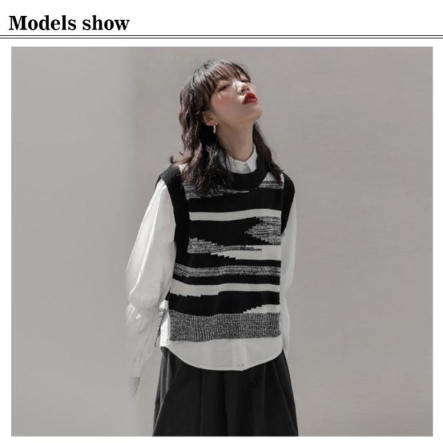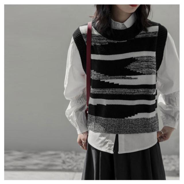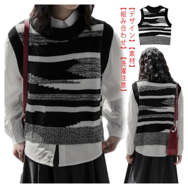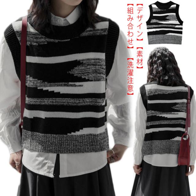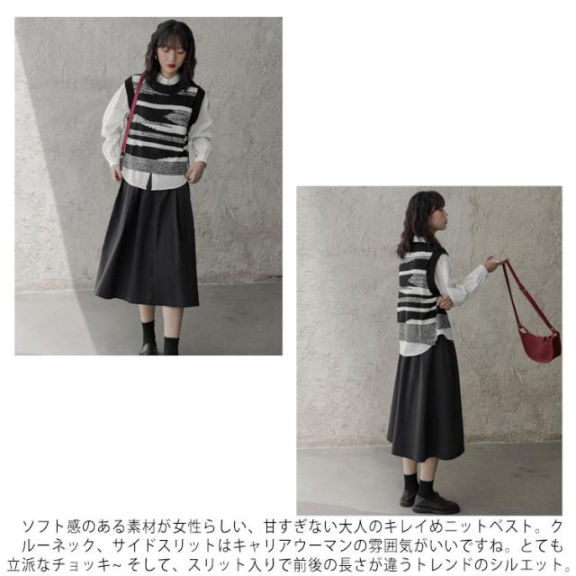 ニットベスト レディース 黒白 柄 春 秋冬 ロング スリット 大きいサイズ クルーネック レイヤード 韓国 ショート丈 冬 黒白 ゆったり おしゃれ 20代 30代 40代 50代