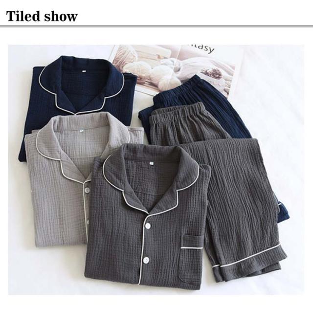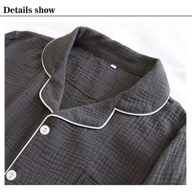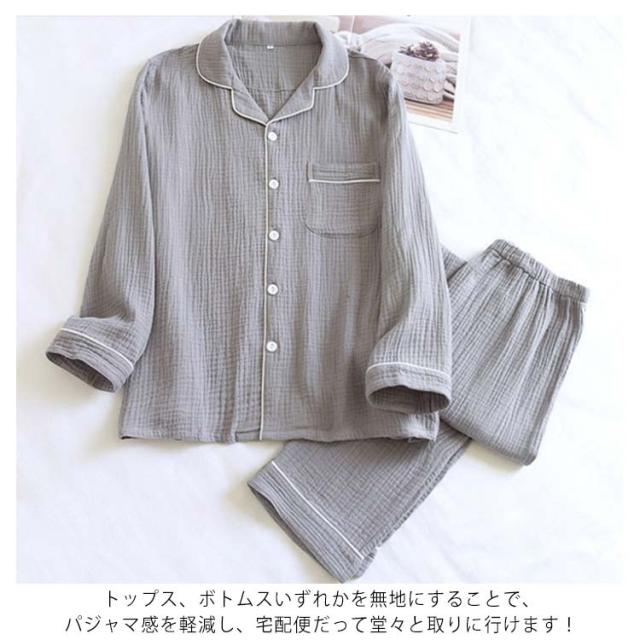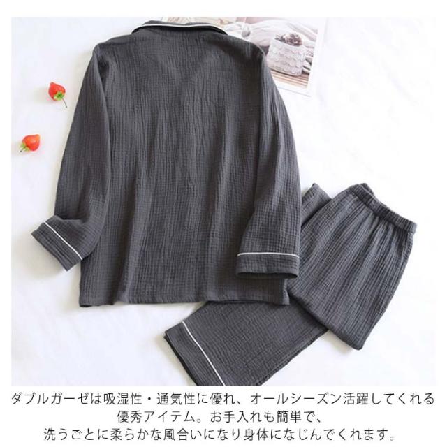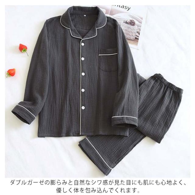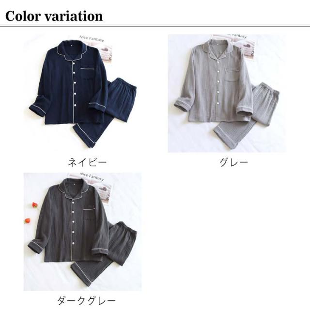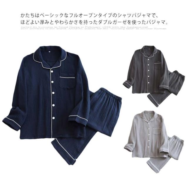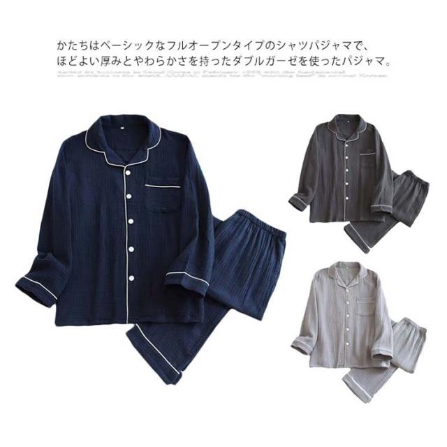 パジャマ メンズ 長袖 前開き 綿100% ダブル 二重 ガーゼ 薄手 無地 ルームウェア ナイトウェア 春秋 パンツ 夏用 入院 長ズボン 部屋着 上下セット セットアップ プレゼント おしゃれ かわいい ネイビー 紺 グレー