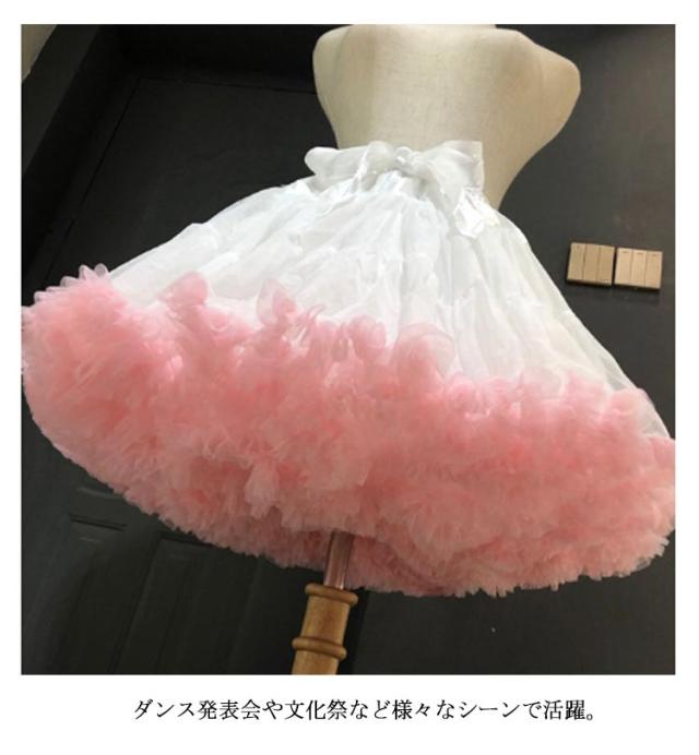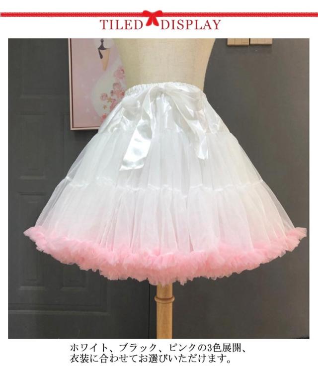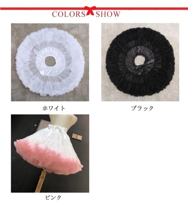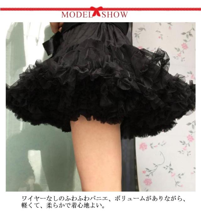 | 裾たっぷりフリルで雲のようにふんわりしたフォルムが可愛い♪ ワイヤーなしのふわふわパニエ、ボリュームがありながら、軽くて、柔らかで着心地よい。 ロリータやメイドコスプレの必須アイテム。 ホワイト、ブラック、ピンクの3色展開、衣装に合わせてお選びいただけます。 ダンス発表会や文化祭など様々なシーンで活躍。 | |
