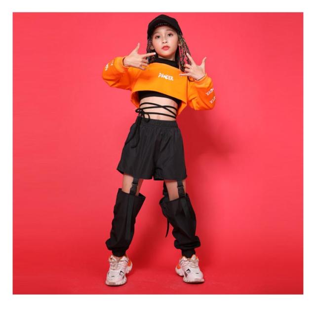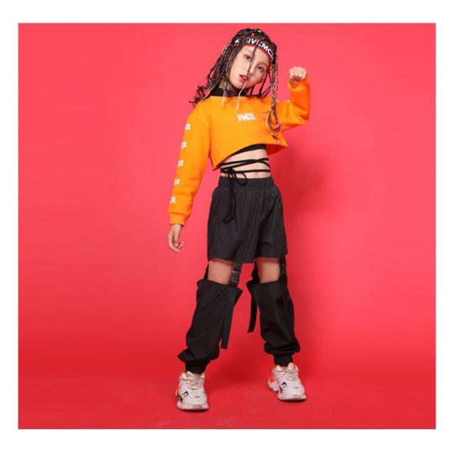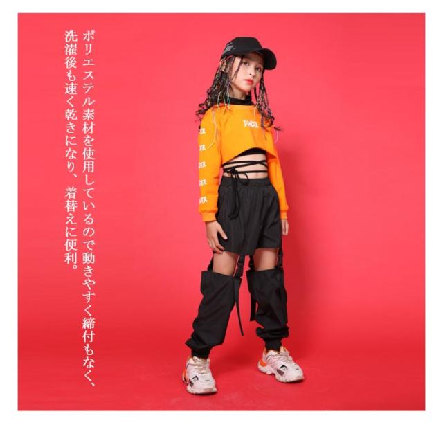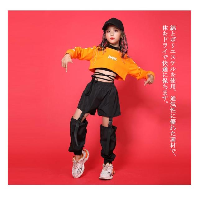 セットアップ ダメージ ダンスウェア 衣装 練習着 ショート丈 スポーツブラ付き ロングパンツ ダンス へそ出し 長袖/スウェット/トレーナー 子ども 女の子 ダンス衣装 ヒップホップ hiphop ジャズ ダンス キッズ