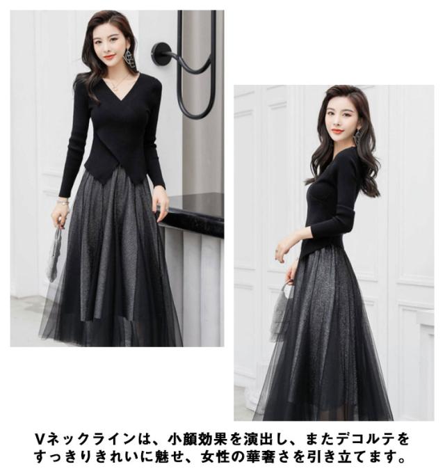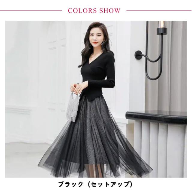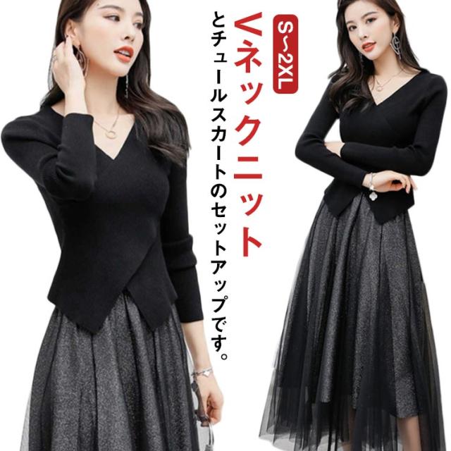 きれいめ 40代 卒業式 セットアップ ウエストゴム ニット 送料無料 おしゃれ 入学式 長袖 レディース チュールスカート 結婚式 フェミニン 着回し レイヤード カジュアル ミモレ丈 ブラック 春 秋 冬 20代 30代 スカートセット
