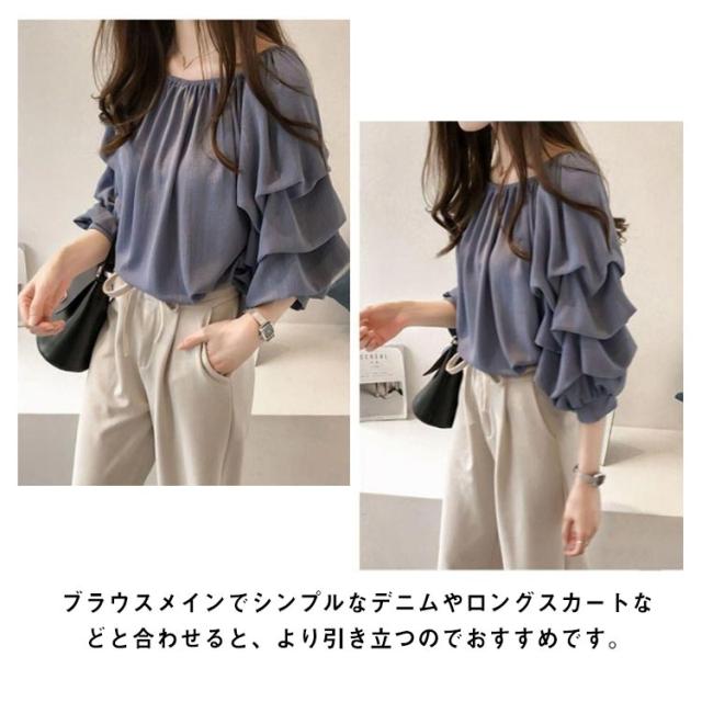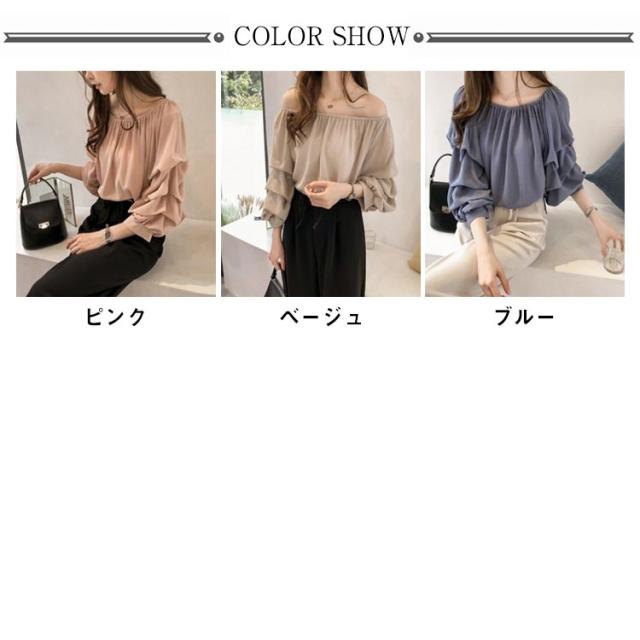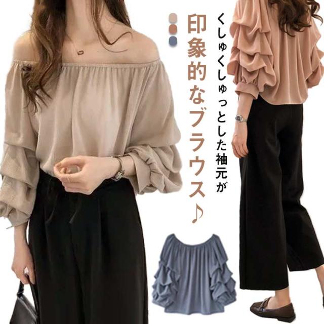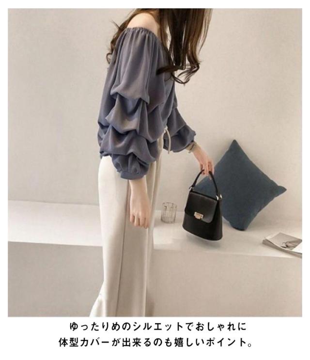 フェミニン レディース シフォンブラウス ボリュームスリーブ 7分袖 オフショルダー 2WAY エレガント トップス プルオーバー ブラウス キレイめ エレガント 春 夏 ラウンドネック