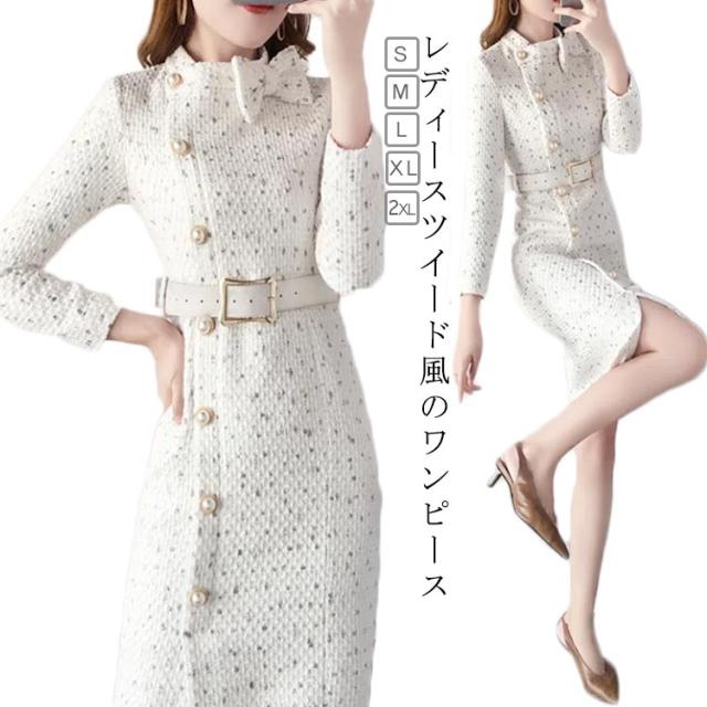 セレモニー ワンピース ワンピース 長袖 ひざ丈 ツイード フェミニン 秋冬 春 秋 冬 春秋 冬 セレモニーワンピース ボウタイリボン レディース 上品 フォーマル エレガント スリット きれいめ 清楚 タイトワンピース