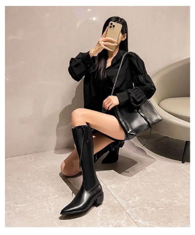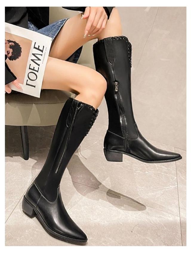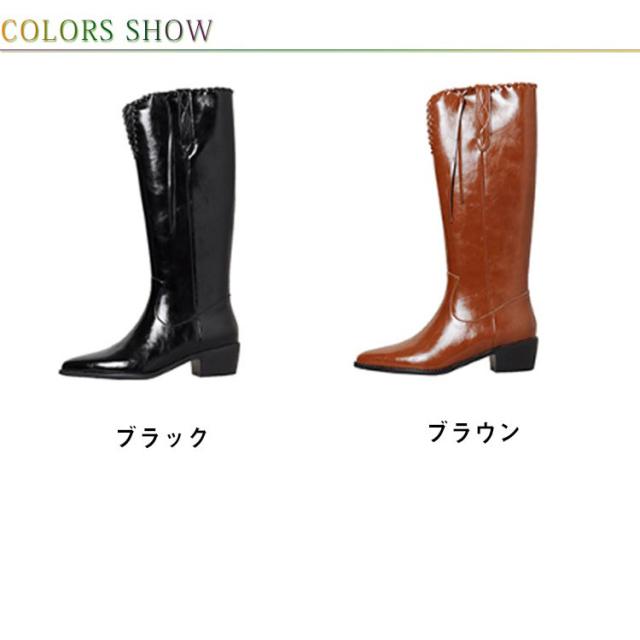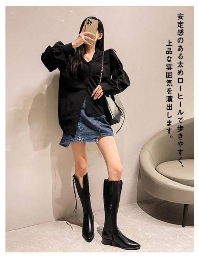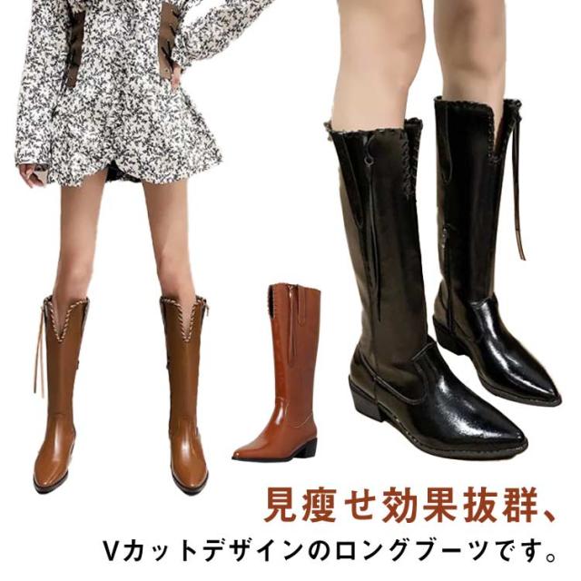 ロング丈 ロングブーツ レディース 冬 ブーツ フェイクレザー 太ヒール Vカット ブラック ウエスタンブーツ 美脚 韓国ファション カジュアル 黒 ポインテッドトゥ ブラウン レトロ 春 秋 歩きやすい