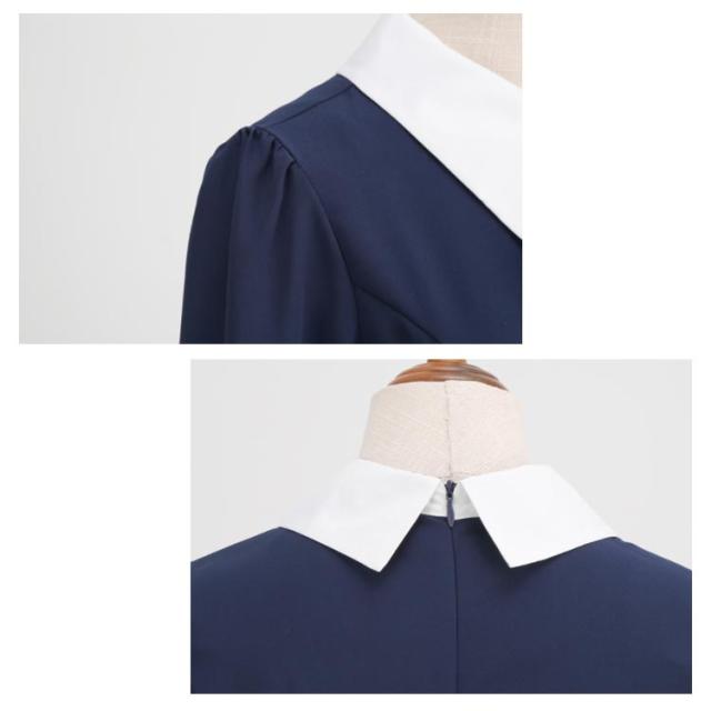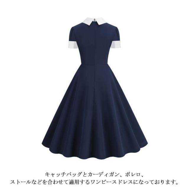 半袖 レトロワンピース 夏 襟あり ドレス リボン付き ワンピース Aラインワンピース お呼ばれ ハイウエスト 可愛い 着痩せ 着痩せ 膝丈 50年代 ボタン 恩会 レトロ
