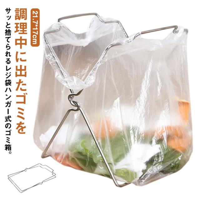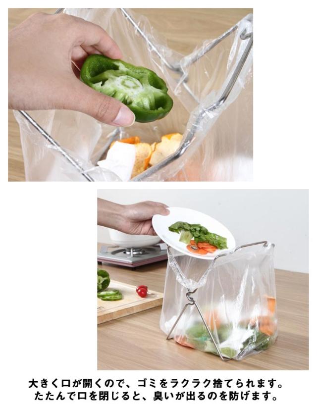 | 調理中に出たゴミをサッと捨てられるレジ袋ハンガー式のゴミ箱。 シンプルなデザイン、接着剤などは不要、とても便利です。 折り畳み式なので使わない時は折り畳んで収納すれば邪魔にならなく、スッキリ省スペースです。 大きく口が開くので、ゴミをラクラク捨てられます。たたんで口を閉じると、臭いが出るのを防げます。 | |