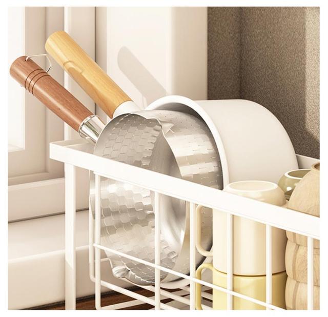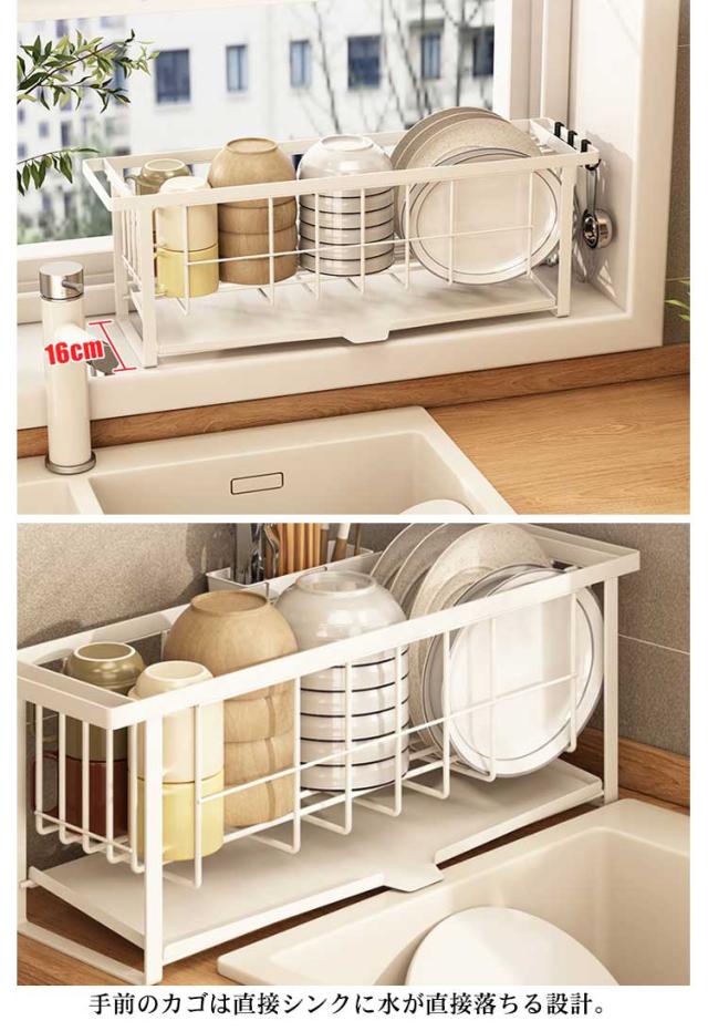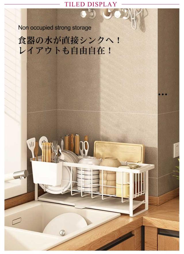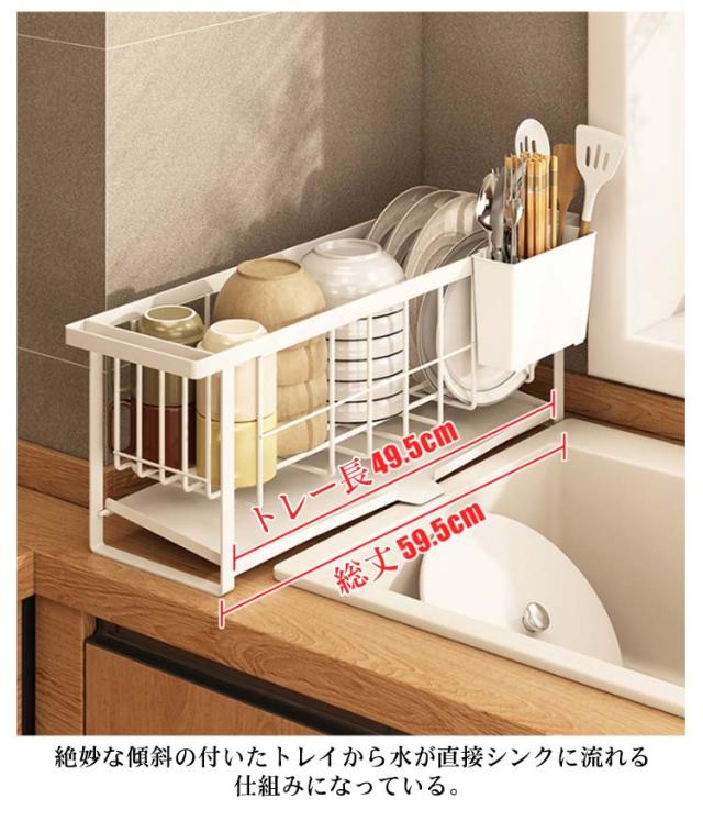 | よく使うグラス・カップ・茶碗・カトラリー・調理道具などをたっぷり収納の水切りラック 食器の水が直接シンクへ!レイアウトも自由自在! 絶妙な傾斜の付いたトレイから水が直接シンクに流れる仕組みになっている。 手前のカゴは直接シンクに水が直接落ちる設計。 | |