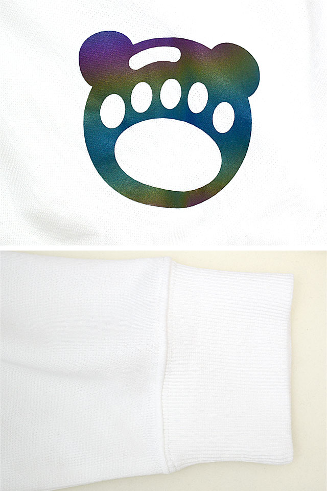 背中部分は無地となっており、裾口にはカメラのフラッシュなどで光り輝く「ミラープリント」で足跡マークをデザインしました。