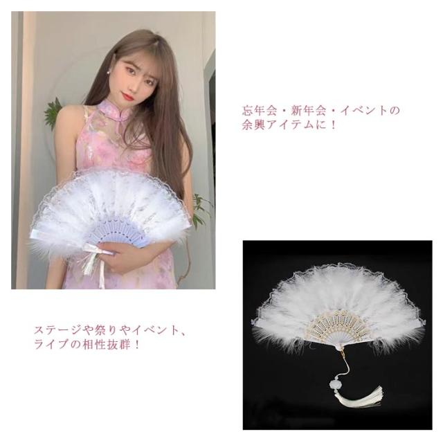 | ダンスの舞台演出にピッタリなとてもふわふわした羽のついたレース扇子です。 軽量だから扇子を振っても疲れない。羽根が抜けにくい、女性にもやすい! 見た目も華やかで練習から気分の上がる、とっておきのアイテムです!! ステージや祭りやイベント、ライブの相性抜群!ドレスを着て扇子踊りのダンスで主役に! 忘年会・新年会・イベントの余興アイテムに! | |