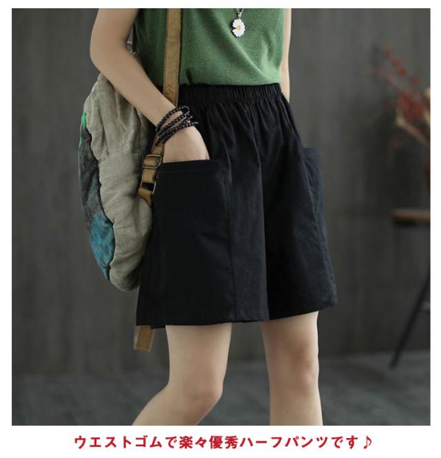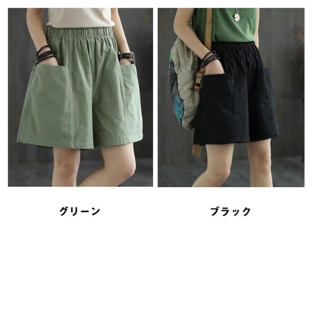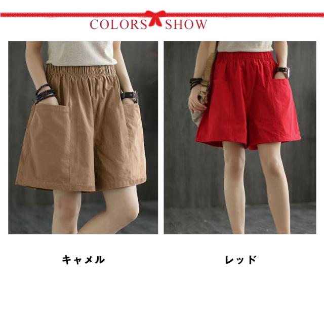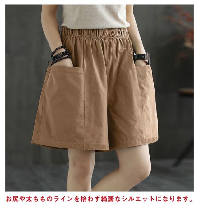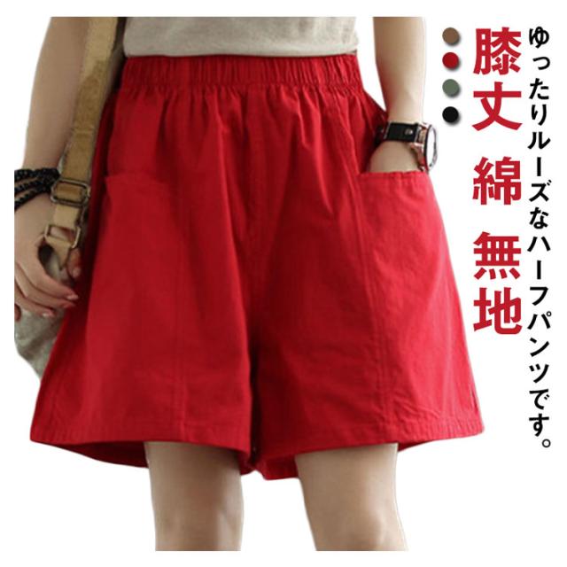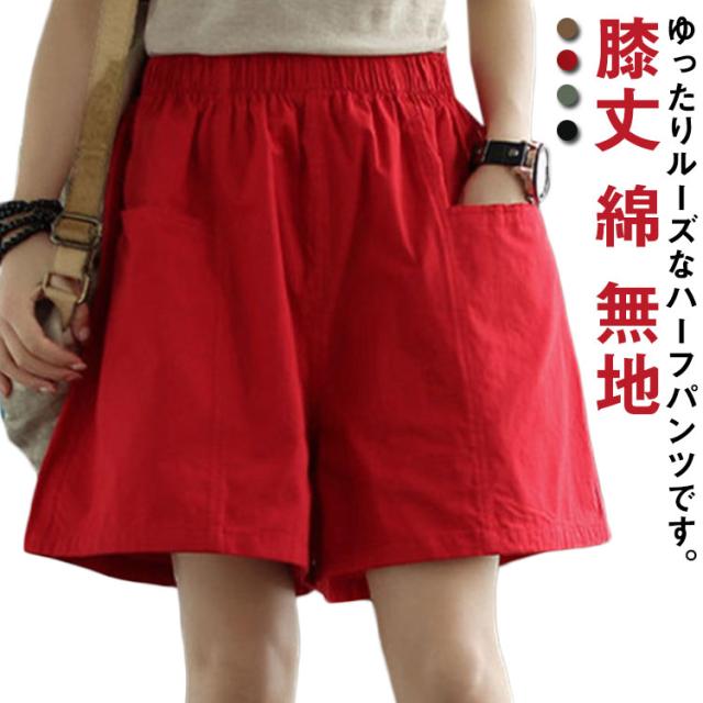 ポケット ハーフパンツ レディース ボトムス キュロットパンツ ひざ丈 無地 膝丈 チノパン 半ズボン 膝上 ショーパン ウエストゴム 綿 ゆったり 春 夏 チノ ショートパンツ チノ チノパンツ