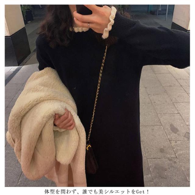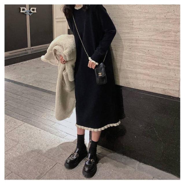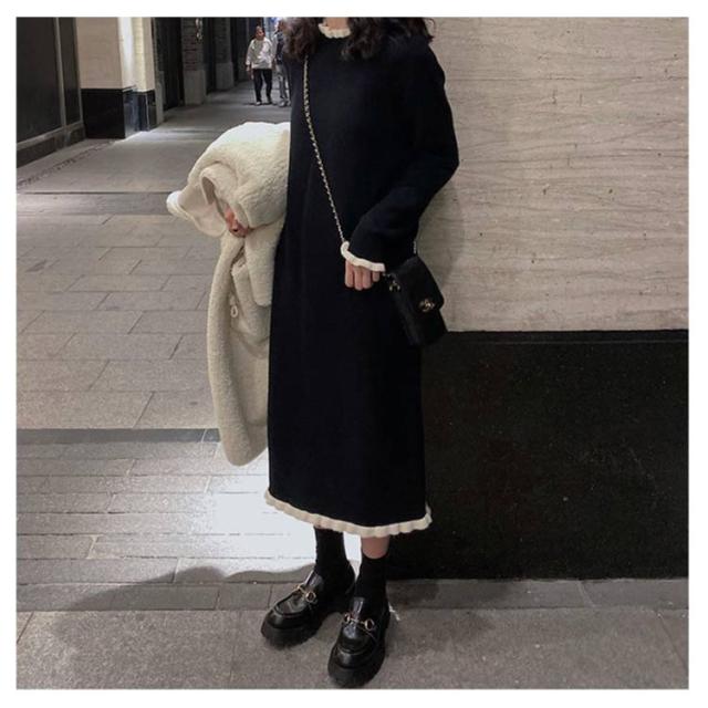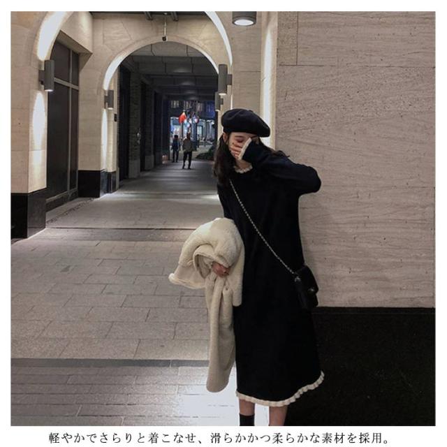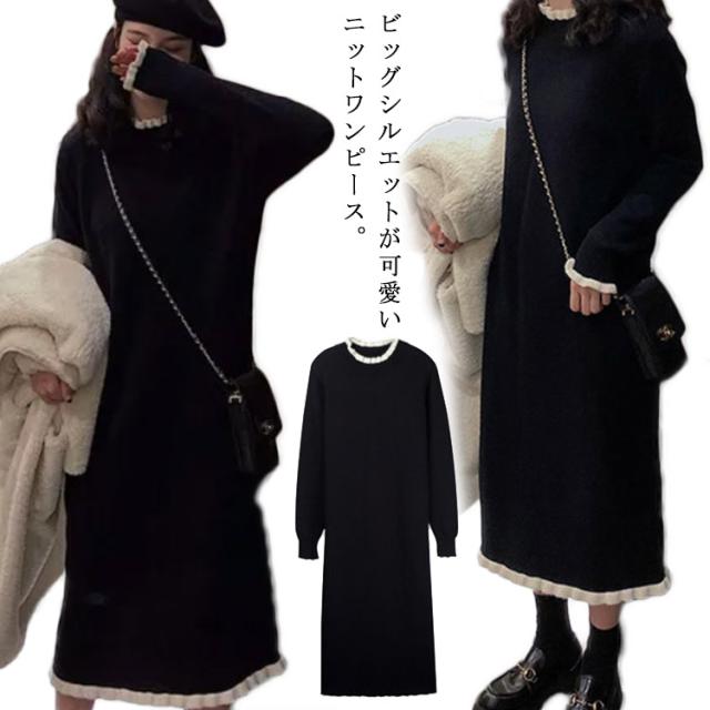 ワンピース ロングワンピース ニットワンピース 長袖 膝丈 クルーネック Aラインスカート 秋冬 秋服 体型カバー プルオーバー レディース フェミニン 大人 秋冬物 おしゃれ カジュアル きれいめ