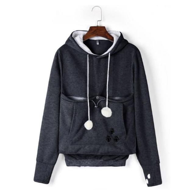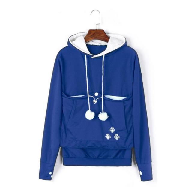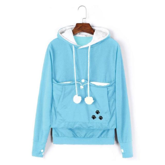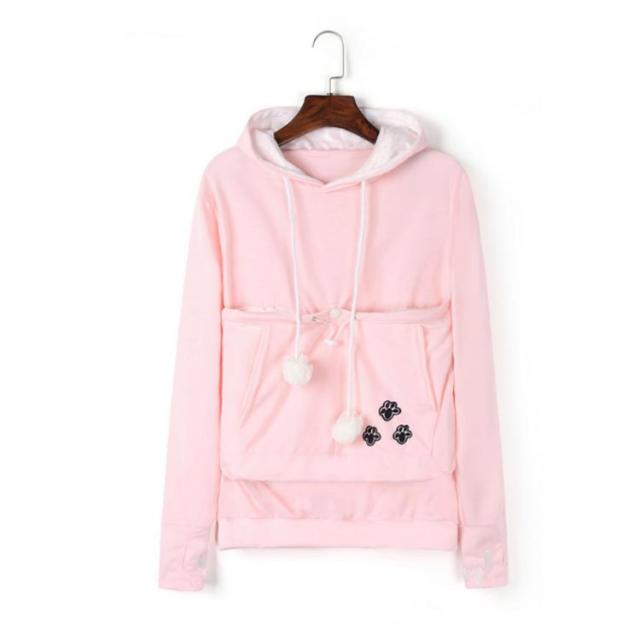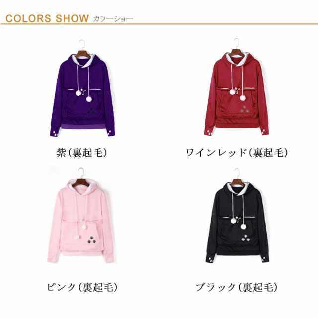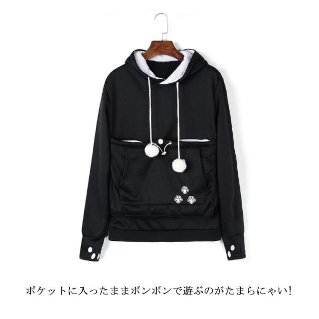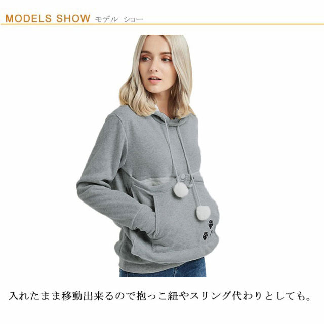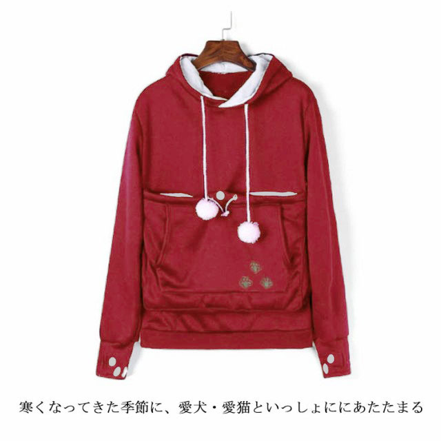 | ワンちゃんネコちゃんも入れる大きなあったかポケット付きパーカー。 入れたまま移動出来るので抱っこ紐やスリング代わりとしても。 裏ボア素材で暖かさ抜群。 猫ちゃんを入れたまま立ち上がることはもちろん出来ますし、ポケットが猫ちゃんの体を支えてくれるので、両手が自由! 子猫から5キロ程度の成猫まで幅広く対応。 ポケットに入ったままボンボンで遊ぶのがたまらにゃい! フード部分にも猫耳がついててかわいい!! 寒くなってきた季節に、愛犬・愛猫といっしょににあたたまる。 | |