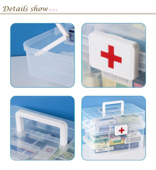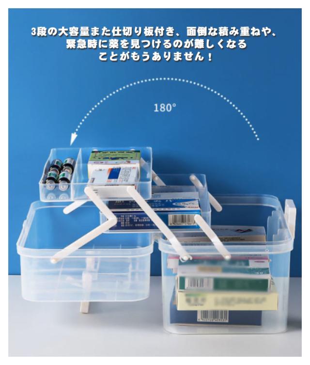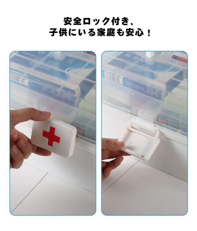| 使いやすい3段大容量薬箱 大容量収納ボックスで様々な救急用品や常備薬をキレイに保管します。 3段の大容量また仕切り板付き、面倒な積み重ねや、緊急時に薬を見つけるのが難しくなることがもうありません! 高品質なPP素材を採用して、防塵・防湿効果があり長くお使いいただけます。 安全ロック付き、子供にいる家庭も安心! 取っ手付きなので緊急時の持ち運びにも大変便利です。 | |