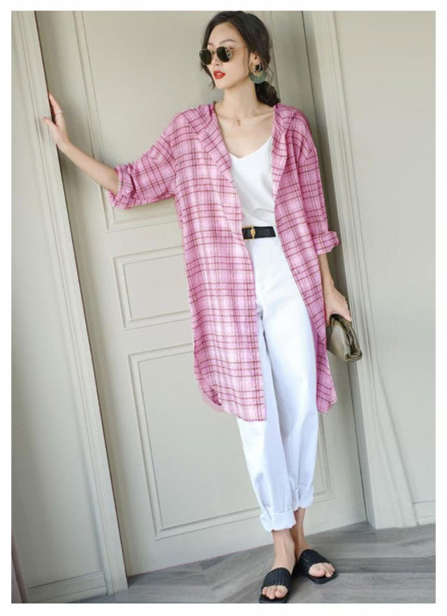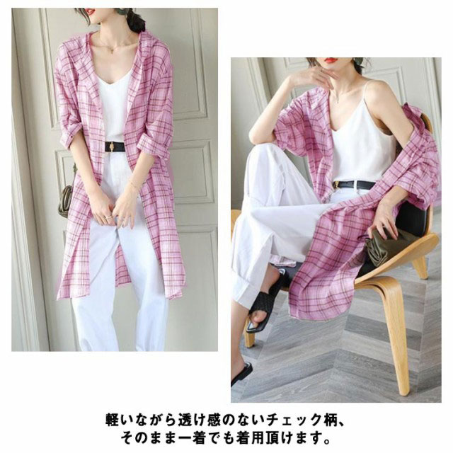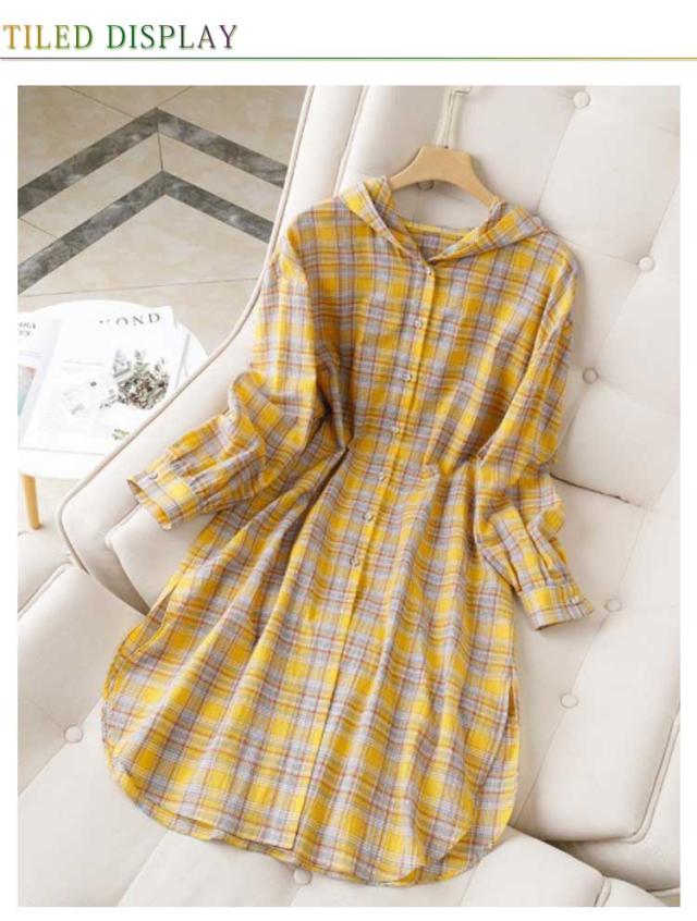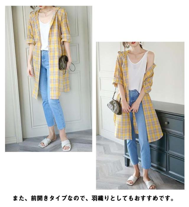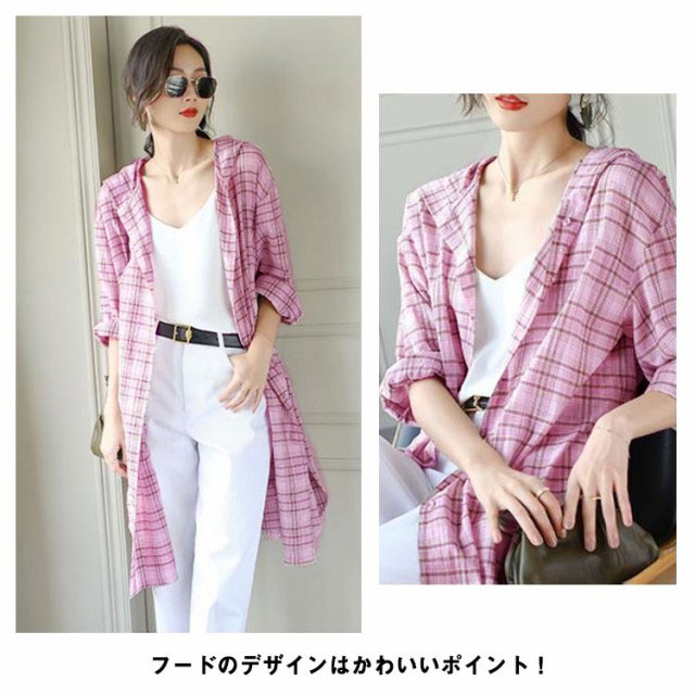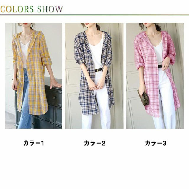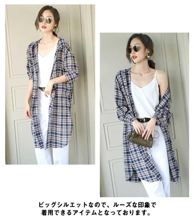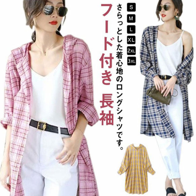 大人 ロングシャツ レディース チェック 2XL 大きいサイズ チェック柄 長袖 シャツ ロング 韓国 ゆったり 体型カバー チェックシャツ カジュアル S M L XL フード付き