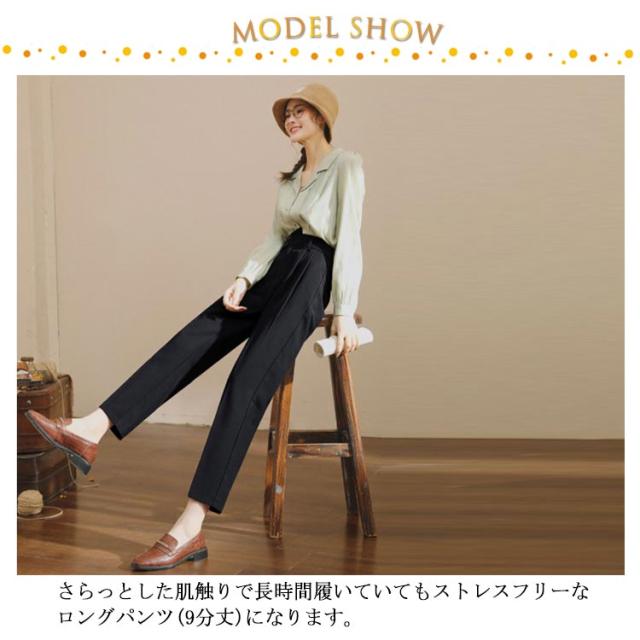 | さらっとした肌触りで長時間履いていてもストレスフリーなロングパンツ(9分丈)になります。 つるっとした滑らかな肌触りでシワになりにくく、 お手入れが簡単なのも嬉しいポイントです。 細身のシルエットとヒップに余裕を持たせた立体裁断により細見えと美尻を実現してくれます。 センタープレスを入れたことで縦のラインが強調され、脚のラインが綺麗に見えます。 | |