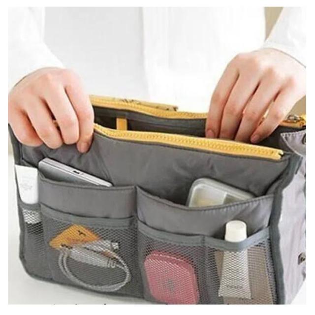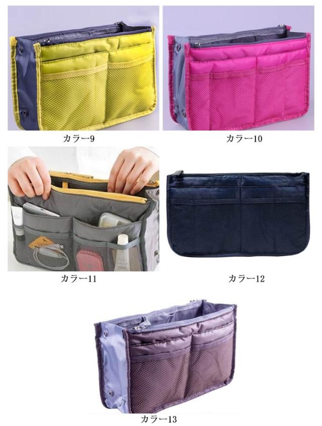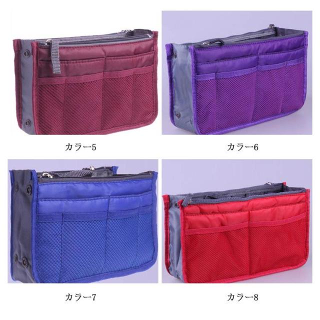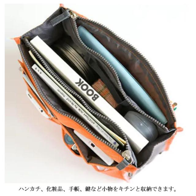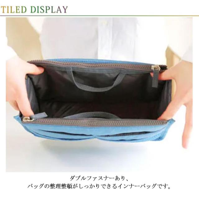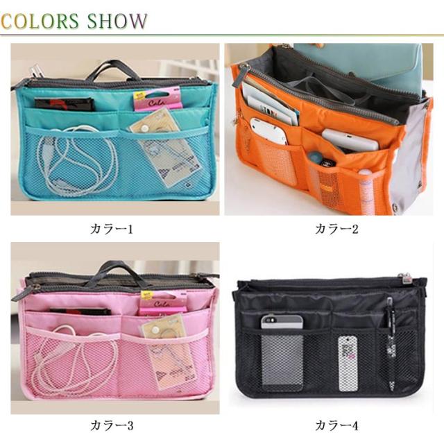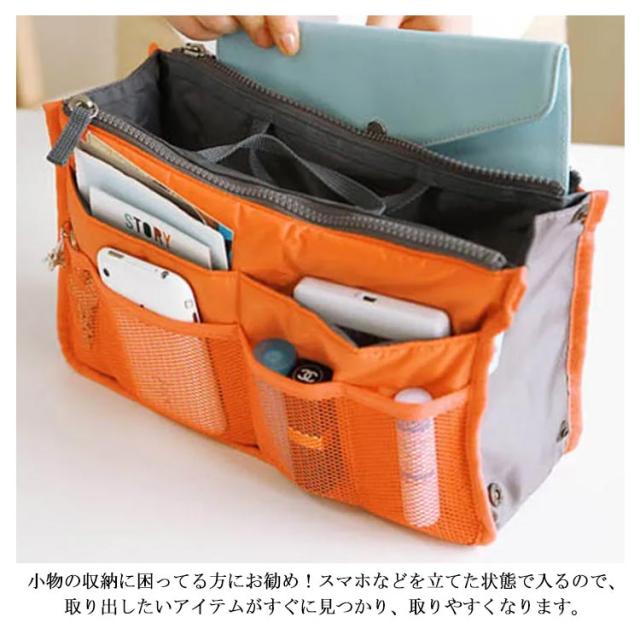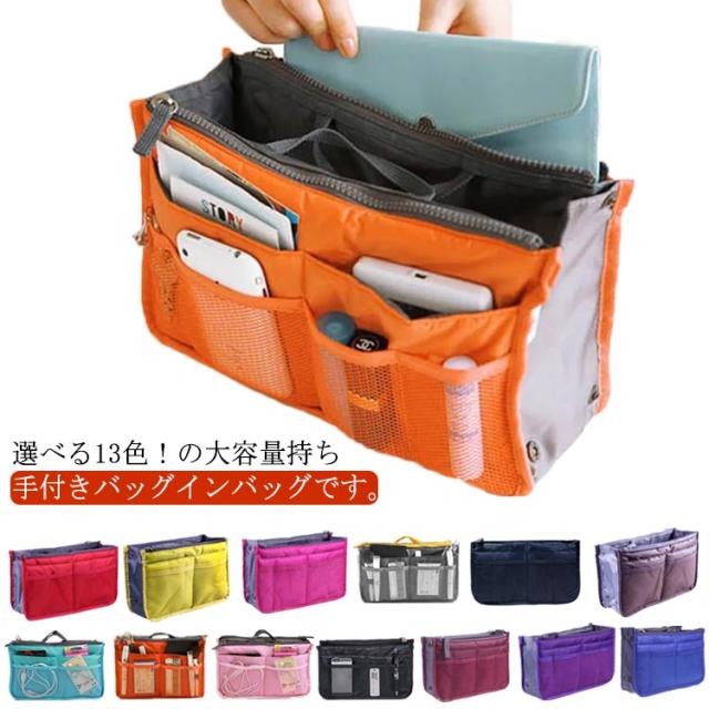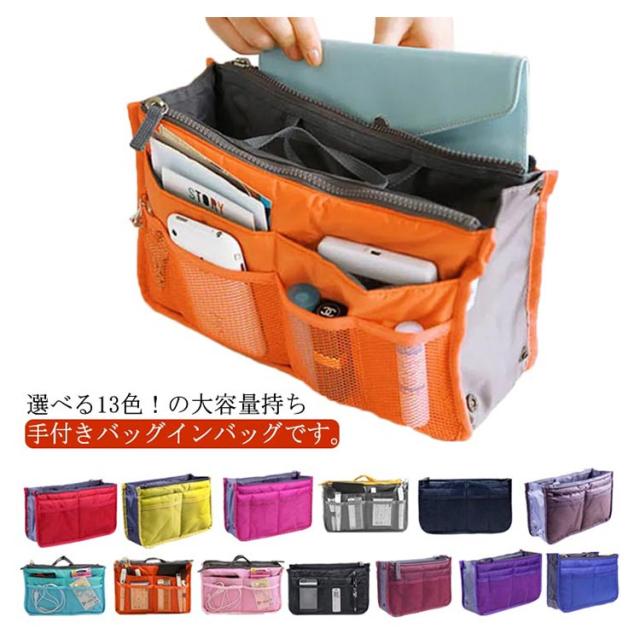 | 選べる13色!の大容量持ち手付きバッグインバッグです。 ダブルファスナーあり、バッグの整理整頓がしっかりできるインナーバッグです。 小物の収納に困ってる方にお勧め!スマホなどを立てた状態で入るので、取り出したいアイテムがすぐに見つかり、取りやすくなります。 ハンカチ、化粧品、手帳、鍵など小物をキチンと収納できます。 | |