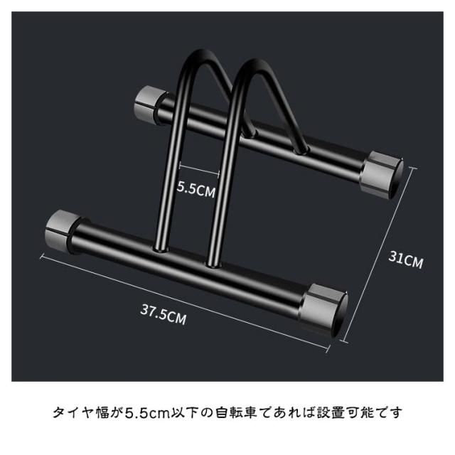 | 室内外、設置場所を選ばない自転車スタンド。 四つゴム足はバランスが調整できます。 凸凹な地面も設置ができています。 表面は粉体塗装の錆びにくい仕上げで長期間綺麗にご使用できます。 駐輪方法は自転車の前輪、又は後輪を駐輪スタンドに差し込みします。 タイヤ幅が5.5cm以下の自転車であれば設置可能です。 | |
