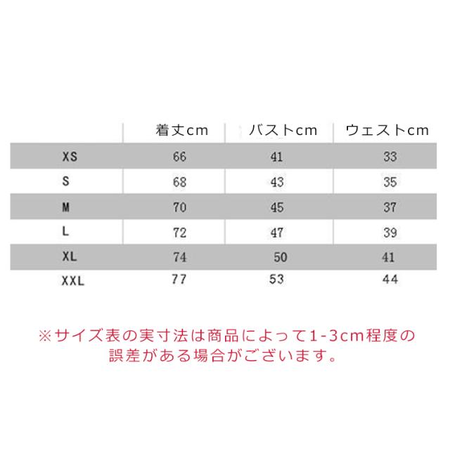 | サイズについての説明 | XS:着丈66cm バスト82cm ウェスト66cm/ S:着丈68cm バスト86cm ウェスト70cm/ M:着丈70cm バスト90cm ウェスト74cm/ L:着丈72cm バスト94cm ウェスト78cm/ XL:着丈74cm バスト100cm ウェスト82cm/ 2XL:着丈77cm バスト106cm ウェスト88cm/ ※サイズ表の実寸法は商品によって1-3cm程度の誤差がある場合がございます。 |