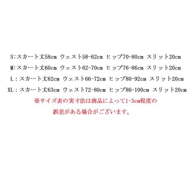 | サイズについての説明 | S:スカート丈58cm ウェスト58-62cm ヒップ70-80cm スリット20cm M:スカート丈60cm ウェスト62-70cm ヒップ76-86cm スリット20cm L:スカート丈62cm ウェスト66-72cm ヒップ80-92cm スリット20cm XL:スカート丈63cm ウェスト72-80cm ヒップ86-100cm スリット20cm ※サイズ表の実寸法は商品によって1-3cm程度の誤差がある場合がございます。 |