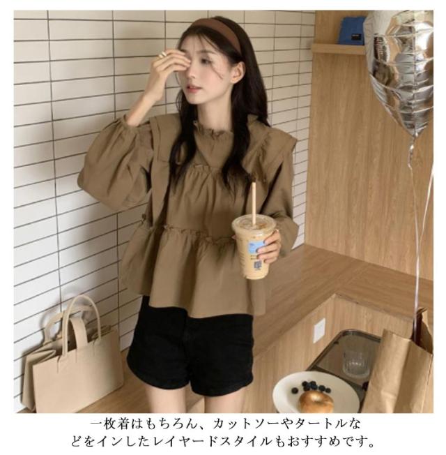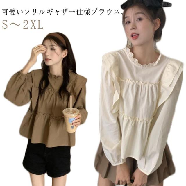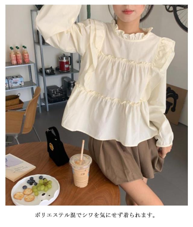 長袖 トップス ぽわん袖 ブラウス きれいめ ギャザー ハイネック フリル 立ち襟 送料無料 無地 レディース ティアード ブラウス レディース トップス 可愛い フリル