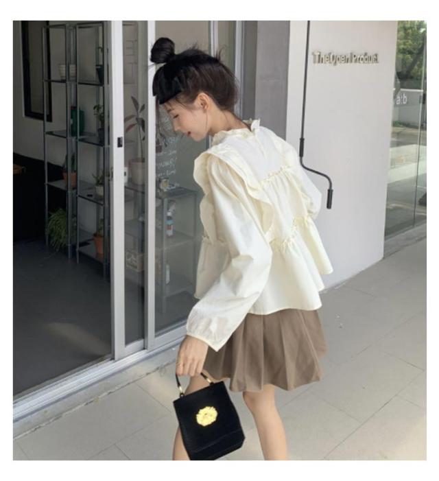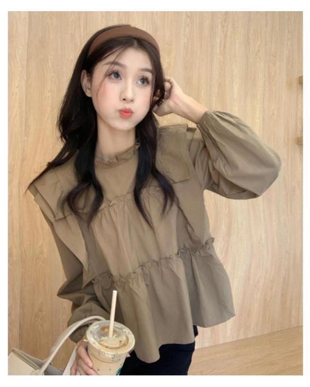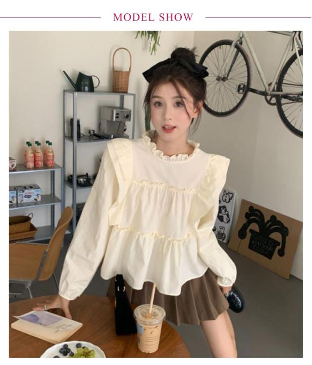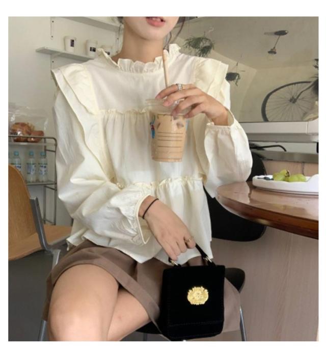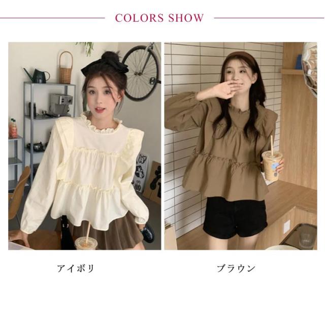 | 可愛いフリルギャザー仕様ブラウス。 一枚着はもちろん、カットソーやタートルなどをインしたレイヤードスタイルもおすすめです。 ポリエステル混でシワを気にせず着られます。 ややボリュームを添えた袖デザインで二の腕カバーも◎ | |