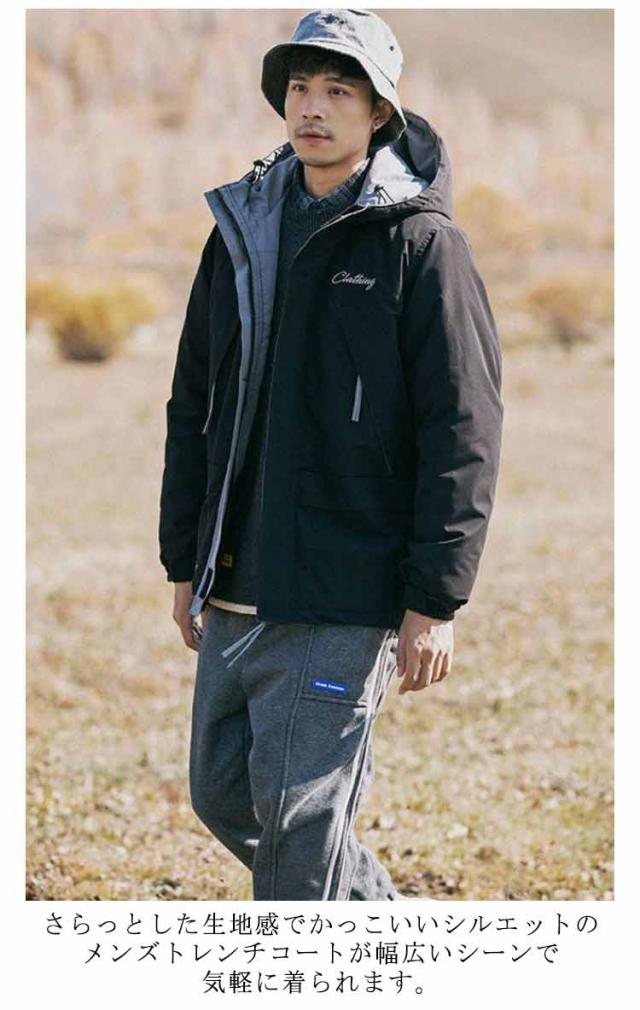 | 防風効果が抜群で春秋に着こなせるウインドブレーカー。それに、素材は通気性があり、肌さわりが柔らかく静電気防止です。 軽さを追求した素材なので、防寒性、防風性を保ちつつ気候が変わりやすい春や秋など肌寒い季節に最適な薄手のブルゾンです。 一枚羽織るだけでどなたでも簡単にスポーツカジュアルなお洒落がお楽しみ頂けます。ちょっとしたおでかけの際など、デイリーユーズしやすいデザインとなっています。 さらっとした生地感でかっこいいシルエットのメンズトレンチコートが幅広いシーンで気軽に着られます。 | |