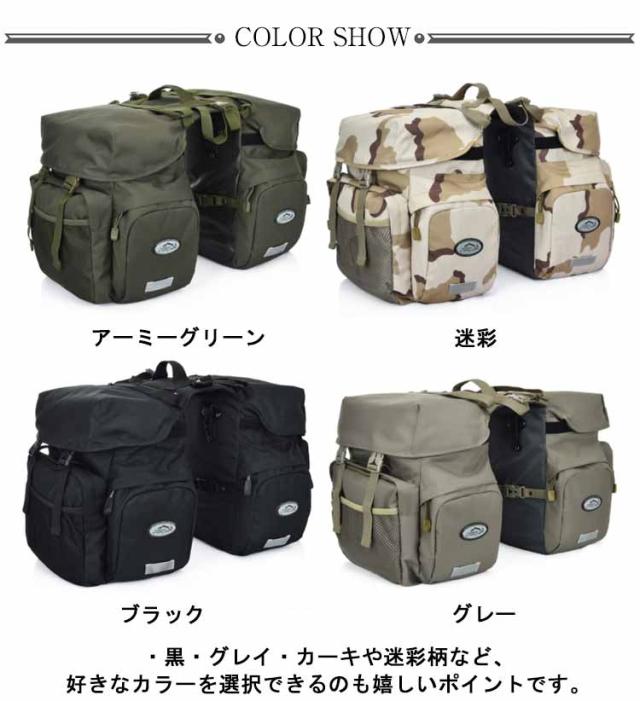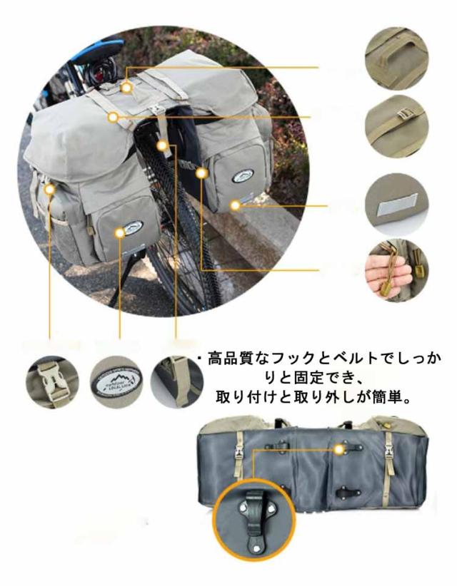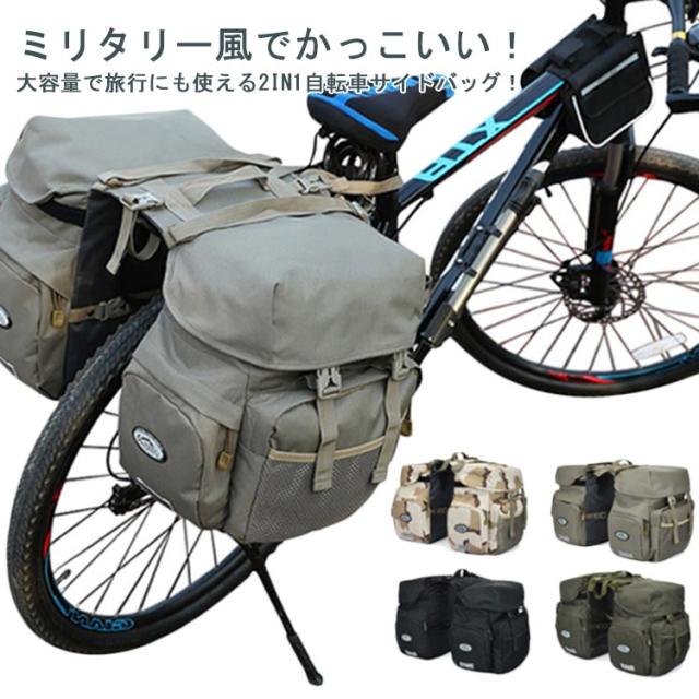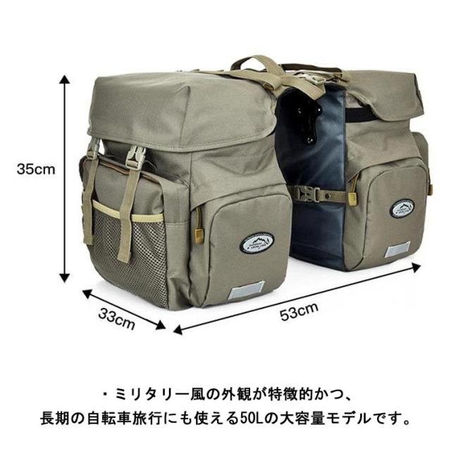 | ・ミリタリー風でかっこいい!大容量で旅行にも使える2in1自転車サイドバッグ! ・ミリタリー風の外観が特徴的かつ、長期の自転車旅行にも使える50Lの大容量モデルです。 ・撥水性に優れた丈夫な素材が使用されていて、防水カバーまでついています。 ・反射ステッカーも縫い付けられているので、夜間に自転車走行しているときも車から見えやすく安全です。 ・高品質なフックとベルトでしっかりと固定でき、取り付けと取り外しが簡単。 ・ほとんどのマウンテンバイク、ロードバイク、通勤用バイクに適しています。 ・黒・グレイ・カーキや迷彩柄など、好きなカラーを選択できるのも嬉しいポイントです。 | |
