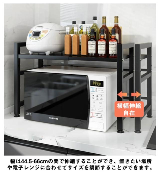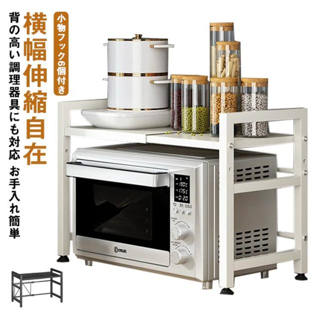 | 【横幅伸縮自在】 【背の高い調理器具にも対応】 【重たい家電もおまかせ】 【お手入れ簡単】 【小物フック6個付き】 | |