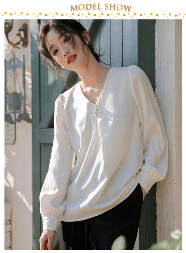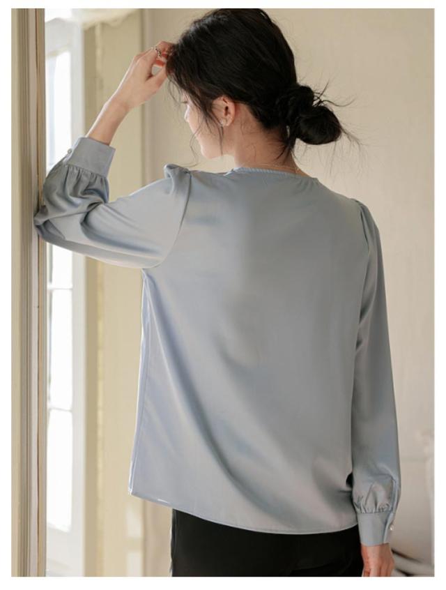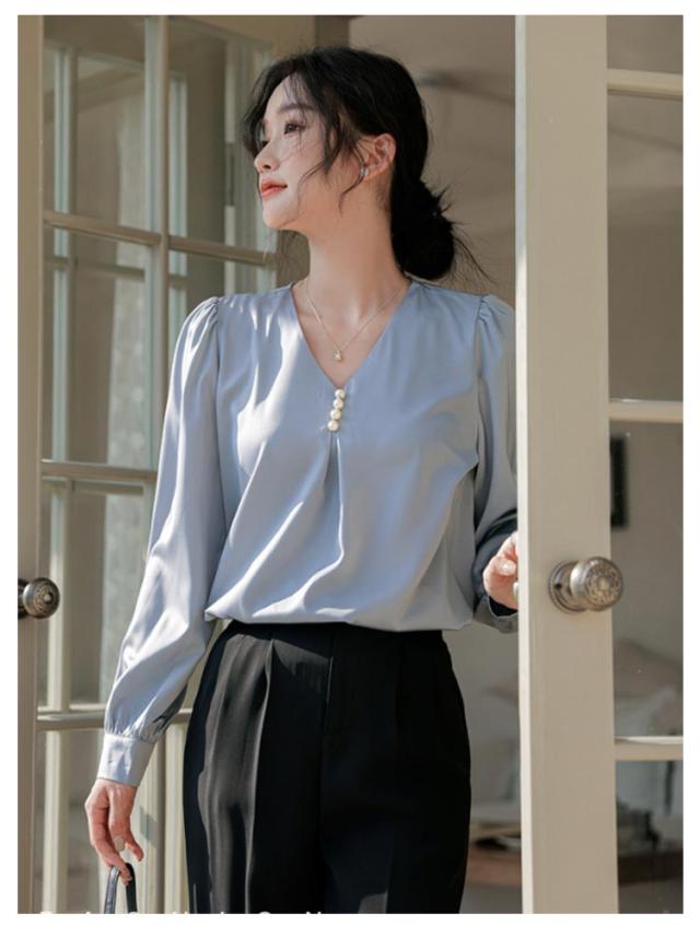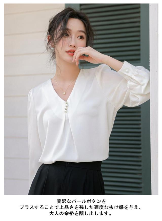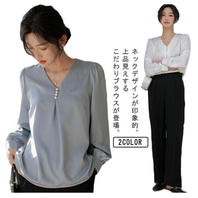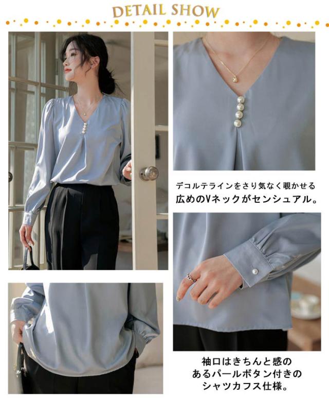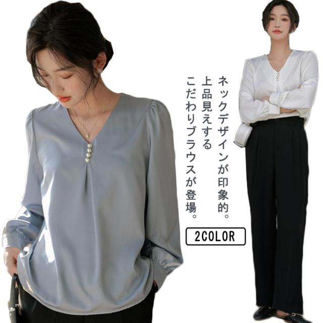 レディース Vネック 40代 長袖 長袖ブラウス 大きいサイズ パール付き 通勤 オフィス シャツ サテン トップス 大人可愛い セレモニー 卒業式 入学式 デイリー お仕事 30代 50代 白 ブルー 無地 シンプル ブラウス