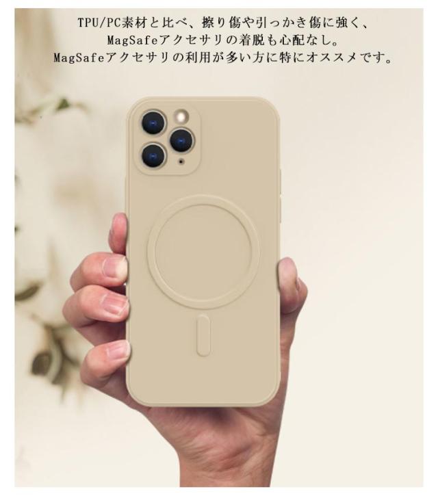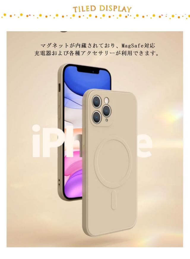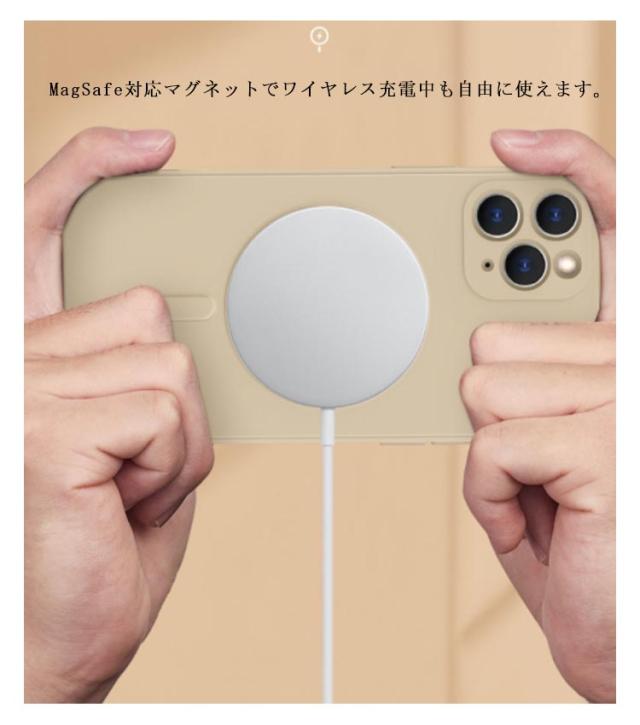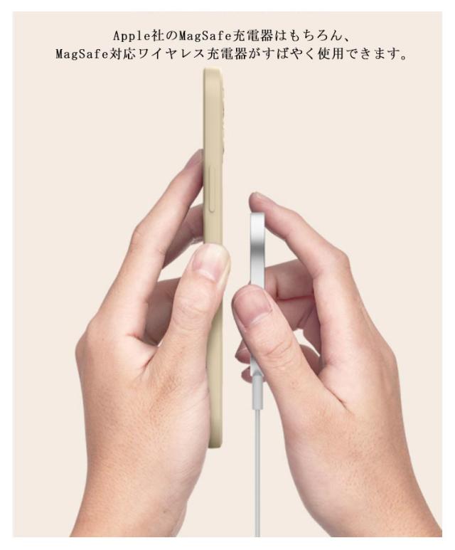 | MagSafe対応のシリコンスケースの発売です。 マグネットが内蔵されており、MagSafe対応充電器および各種アクセサリーが利用できます。 生活がもっと便利になる、MagSafe対応アクセサリーが楽しめます。 衝撃吸収性に優れたTPU(ウレタン)のハイブリット構造で、あなたのスマートフォンのデザインを活かしながらも頼もしく保護します。 本体との接触面はマイクロファイバーを施し、通気性の確保により湿気を溜まりづらくしております。 Apple社のMagSafe充電器はもちろん、MagSafe対応ワイヤレス充電器がすばやく使用できます。 MagSafe対応マグネットでワイヤレス充電中も自由に使えます。 TPU/PC素材と比べ、擦り傷や引っかき傷に強く、MagSafeアクセサリの着脱も心配なし。MagSafeアクセサリの利用が多い方に特にオススメです。 高弾力のTPUで、着脱も簡単。外部からの衝撃を優しく吸収します。 本製品のマグネットはApple社のMagSafe対応ケースと同等の磁力を発揮します。 | |