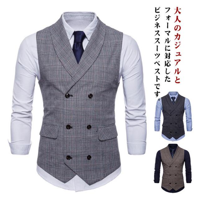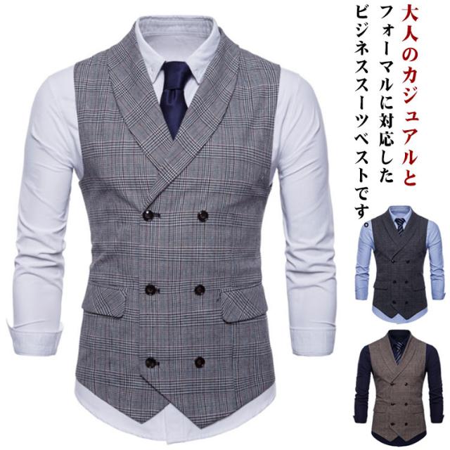 スーツベスト メンズ メンズファッション テーラードベスト ベスト フォーマル 送料無料 ビジネス スリム ダブルボタン Vネック ジレ ベスト襟付き イギリス風 フィット 男性用 結婚式 チェック
