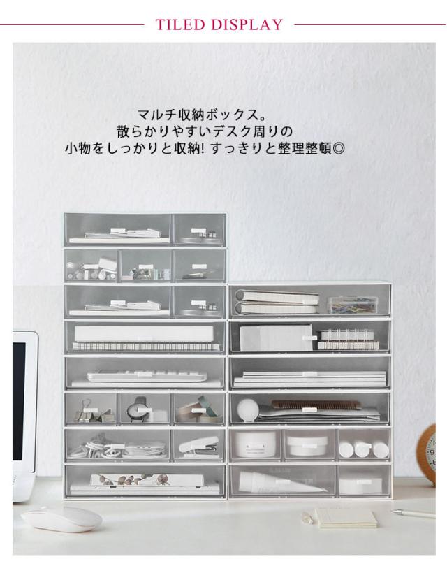 | 組合せ自由+機能的でおしゃれな卓上収納ボックスです。ニーズに応じてセットと仕様が選べます♪ マルチ収納ボックス。散らかりやすいデスク周りの小物をしっかりと収納! すっきりと整理整頓◎ 重ねても安定! 引き出しの 分割ガイドライン付き! 引き出しやすい取っ手! 引き出し内がわかりやすい透明ボックス。 | |
