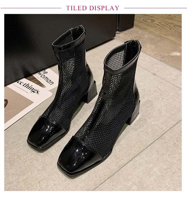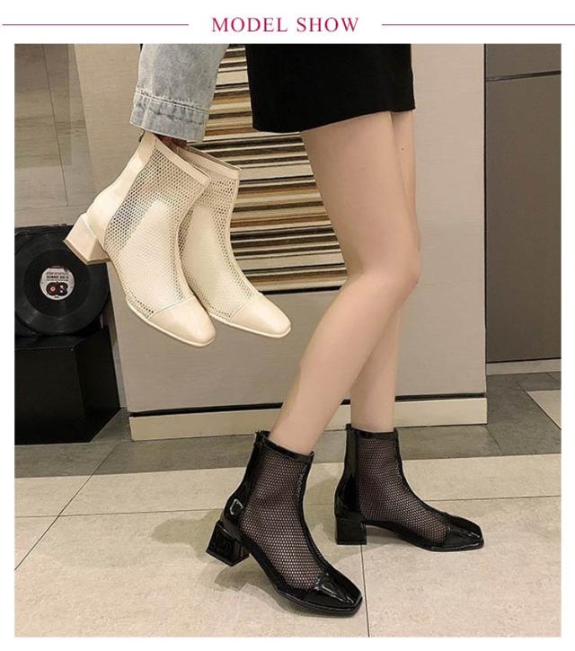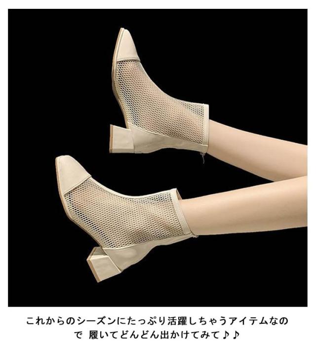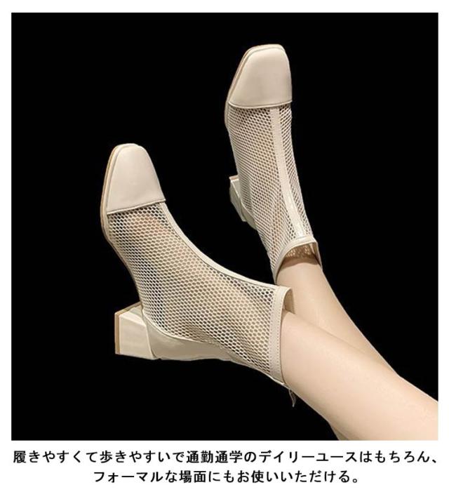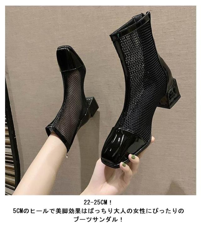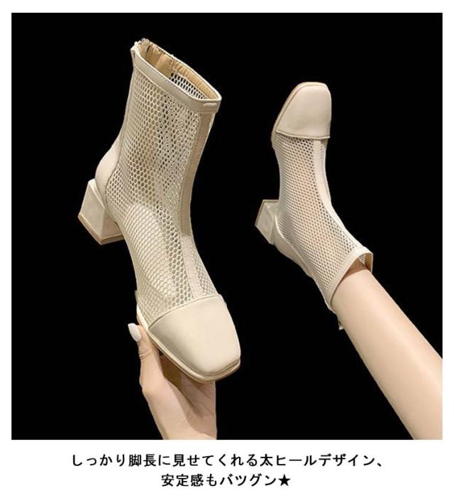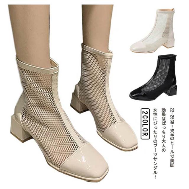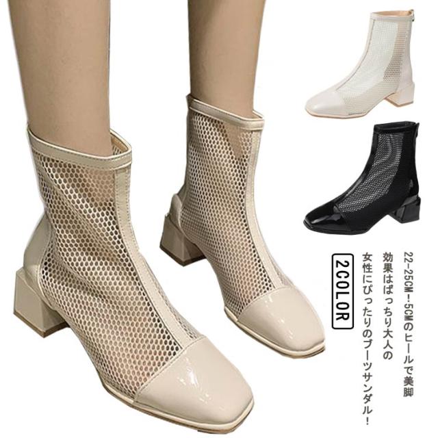 サマーブーツ 痛くない 美脚 メッシュ メッシュブーツ 通気 レディース メッシュ 黒 スクエアトゥ オフホワイト メッシュ ヒール5cm サンダル ショートブーツ 夏 歩きやすい 靴 ブーツサンダル シューズ 軽い 可愛い 太めヒール 切り替え