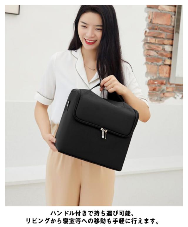 | 散らかりがちな化粧品をお洒落に収納するコスメボックス。【3段】【ショルダーストラップ付き】 二段式の収納トレイとワイドな下の段でコスメ道具をすっきりと納めることができます。 ファスナーで蓋が出来るので、中身が落ちることもありません。 ハンドル付きで持ち運び可能、リビングから寝室等への移動も手軽に行えます。 ショルダーストラップ付きで肩掛けや斜め掛けの持ち運びも可能です。 【ワイドトレイ】ファンデーション、アイシャドウ、リップ、アクセサリーetc…小物をまとめて置くだけで収納が出来ます。 【スタンド収納】トレイ下の深くて広い収納スペース。背の高いスキンケア用品やメイクブラシ等を立てて収納可能。 | |