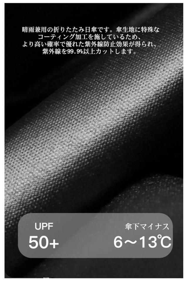 | 【重量182g】【長さ18cm】【UPF50+】【完全遮光】【傘下マイナス6-13℃】【収納袋付】【全11色】 折りたたみができるので、気軽に持ち歩け、日焼け対策アイテムとして最適です。また、完全遮光なので、強い日差しを遮り、猛暑でも涼しい快適に過ごすことができます。 夕立などの急な雨にも使え、一本あると便利です。降雨時のご使用においても防水性に優れているので雨の日、晴れの日兼用ご利用頂けます。毎日気軽に持ち歩けるよう、軽くてコンパクトなのも嬉しいポイントです。 シンプルなデザインであらゆるシーンに馴染む折りたたみ傘です。本体は僅か182gで、折りたたんでコンパクトサイズになるので、携帯するのに便利です。収納袋も付いていて、カバンに常備しておけるので、持ち運びやすいです。 晴雨兼用の折りたたみ日傘です。傘生地に特殊なコーティング加工を施しているため、より高い確率で優れた紫外線防止効果が得られ、紫外線を99.9%以上カットします。 親骨はアルミ合金製により、しなやかで折れにくい丈夫です。より強く、使いやすい傘になりました。 ハンドルは高品質ABS樹脂素材で、手にしっくりきて、滑りにくくなっています。また長時間傘を差しても手首が疲れない。 豊富なカラー展開で装いに合わせてチョイス。 | |